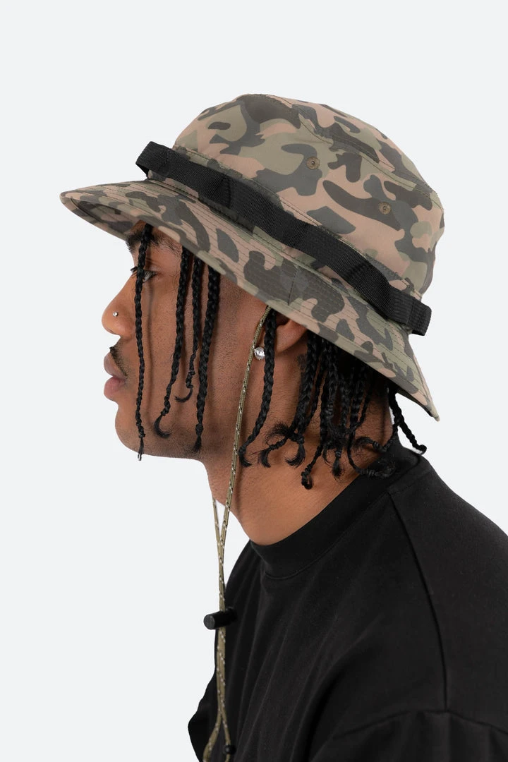 - The Mnml Accessories Camo Bucket Hat features a stylish camouflage design, making it a versatile accessory for any casual or outdoor look.