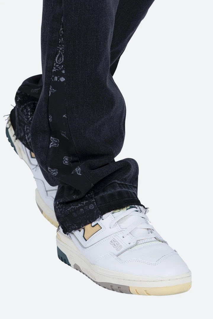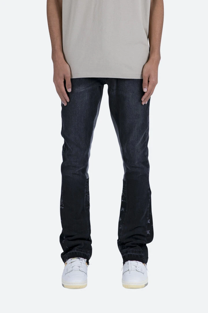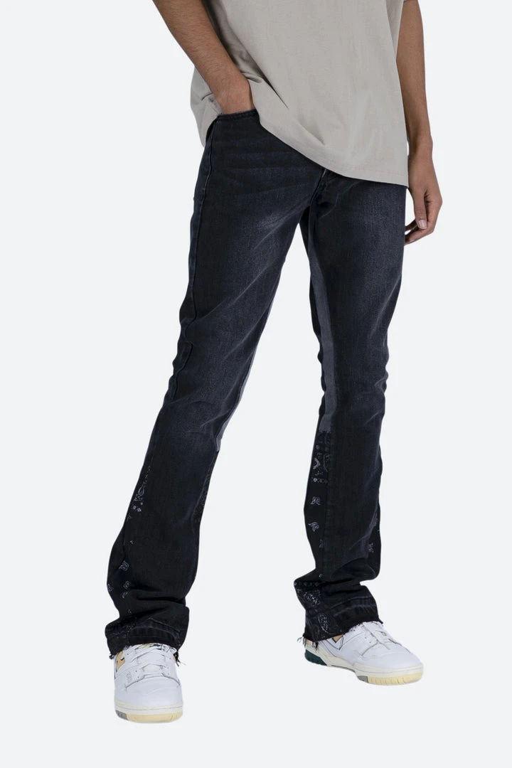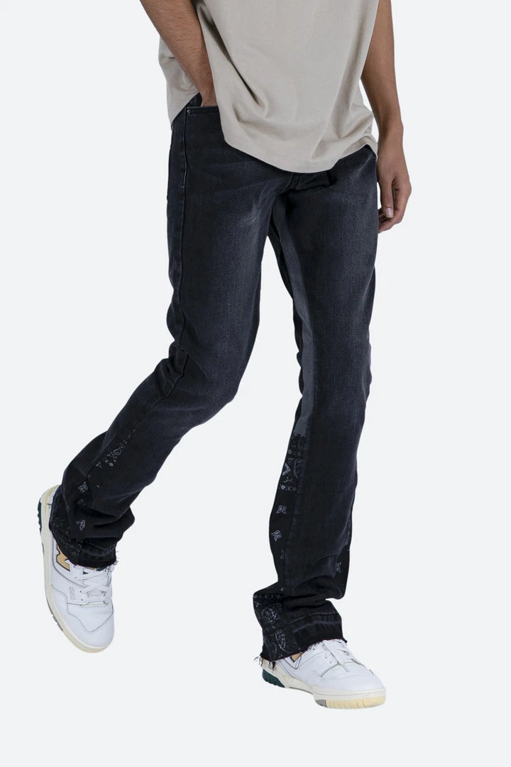 - Elevate your style with the Mnml B167 Paisley Flare Denim in Black. These high-quality flare jeans feature a unique paisley design, offering a retro-inspired look that’s perfect for any casual or semi-formal occasion.