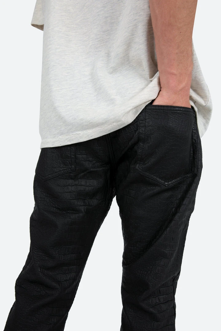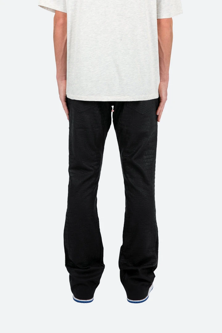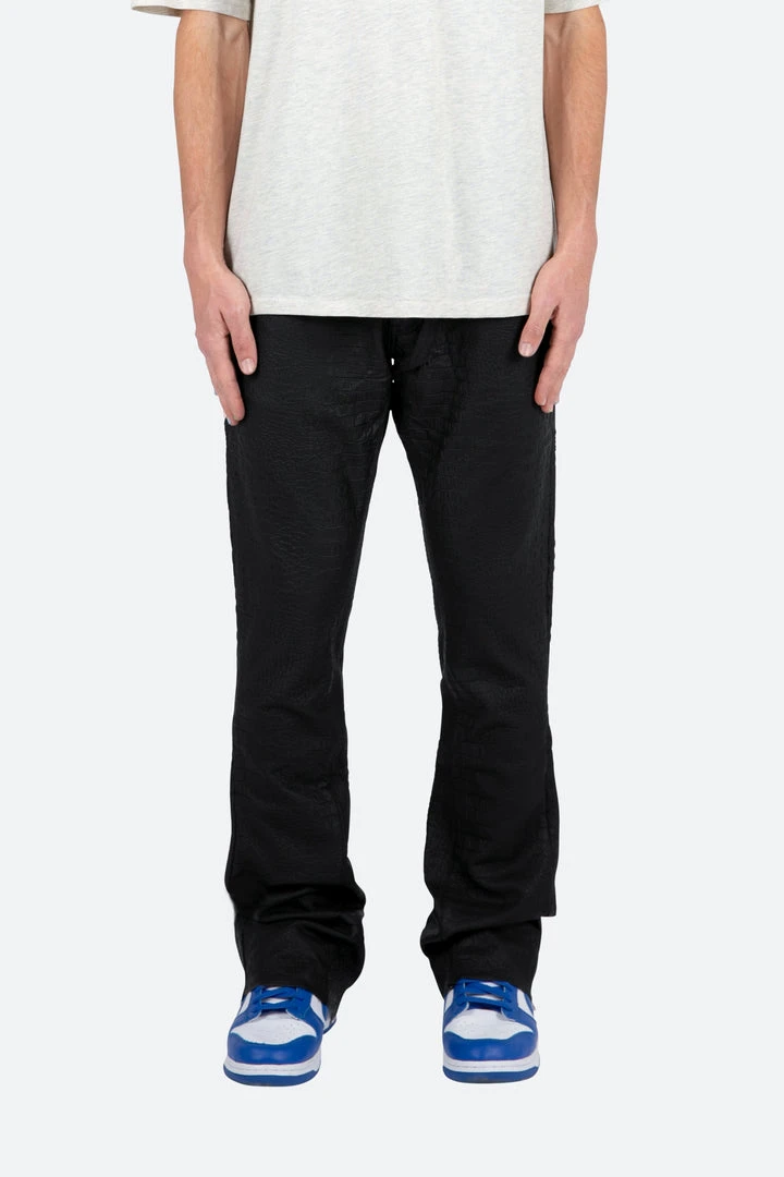 - Elevate your style with the Mnml B478 Croc Flare Pants in Black. These high-waisted denim flare pants are designed for both men and women, offering a sleek and modern look.