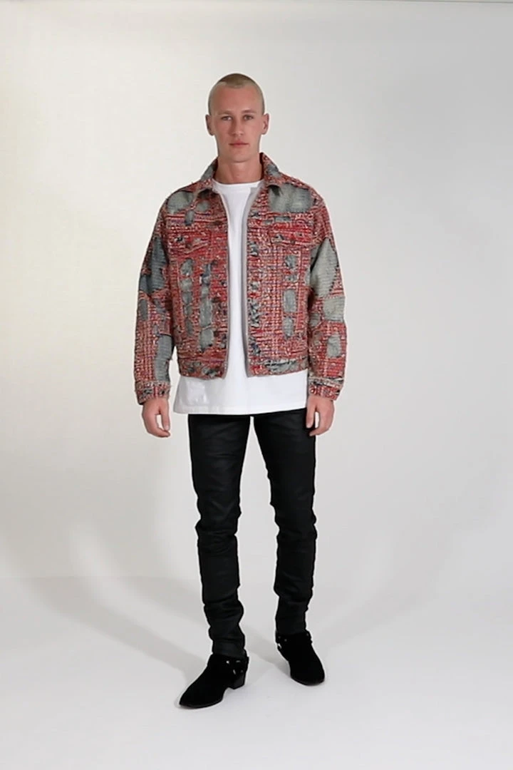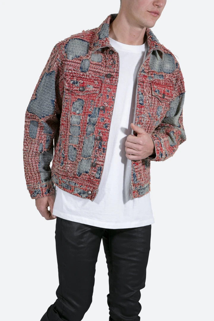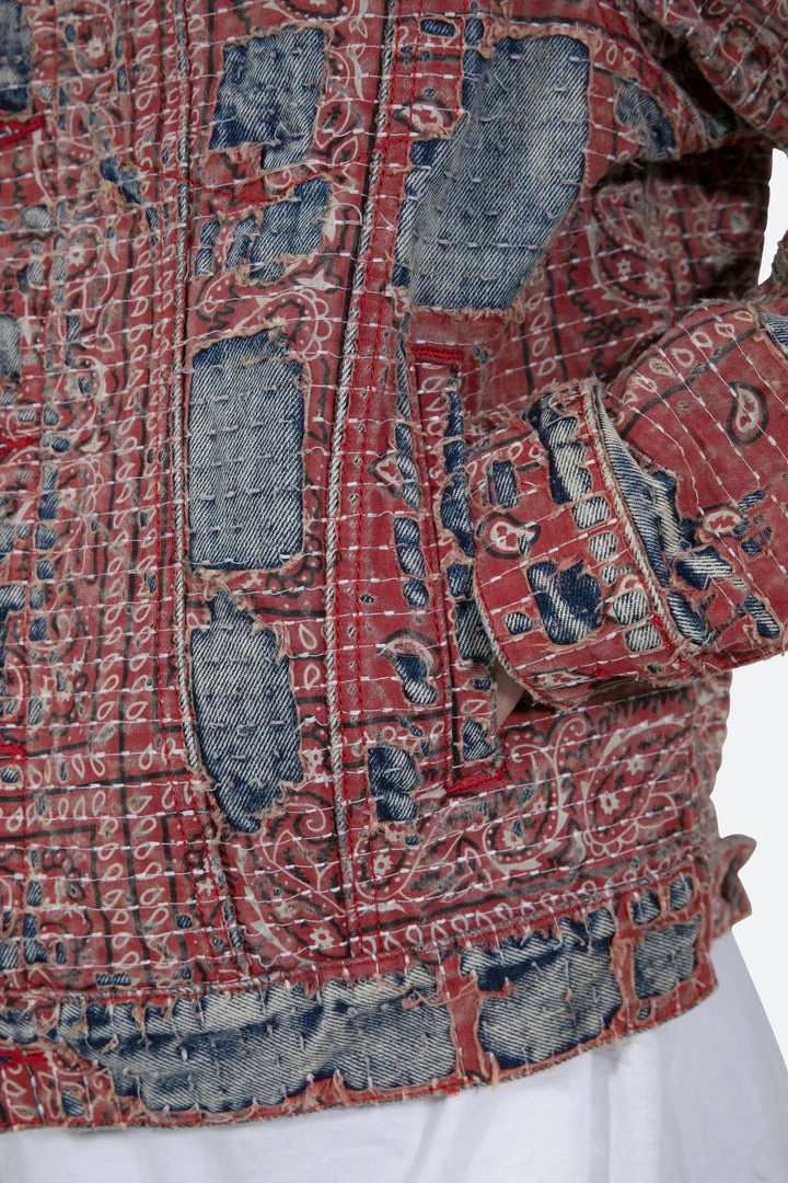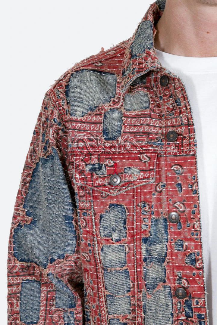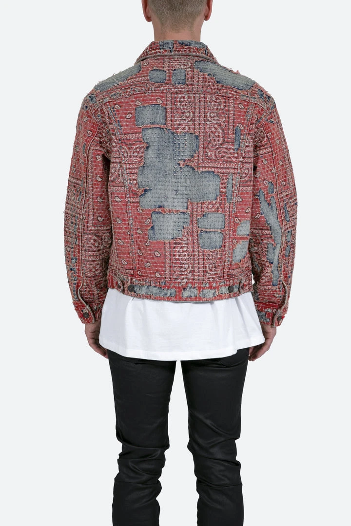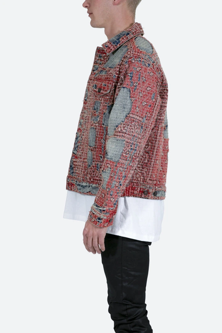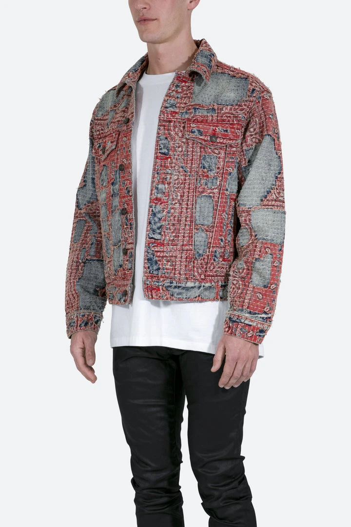- Elevate your style with the Mnml Boro Paisley Trucker Jacket. Featuring a unique Blue/Red paisley print on vintage denim, this jacket is a standout piece for any casual or streetwear look.