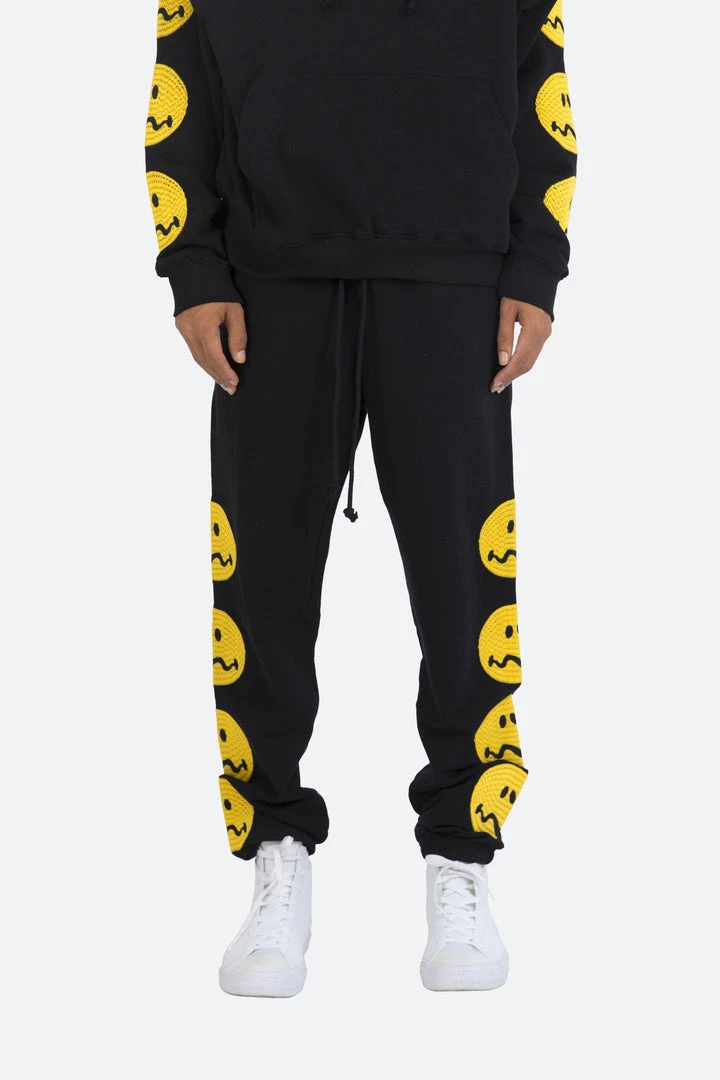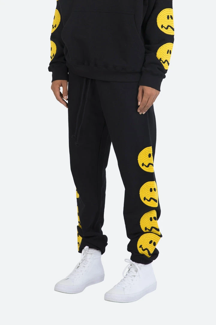 - The unique ‘Crooked Smile’ design adds a touch of personality to your outfit, making these sweatpants a standout piece in your collection. Pair them with your favorite sneakers for a complete look.