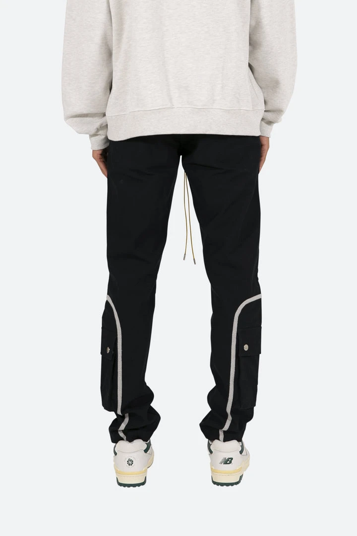 - Elevate your style with the Mnml Contrast Taped Cargo Pants in Black. Designed for the modern man, these pants combine functionality with a sleek, urban aesthetic.