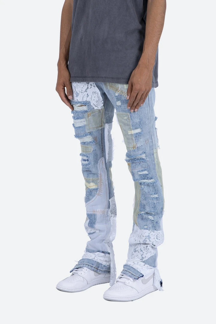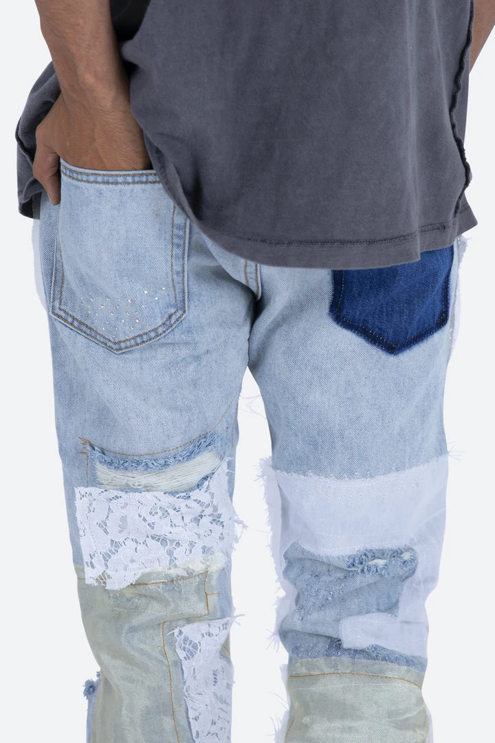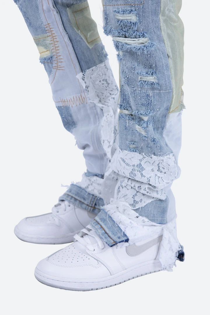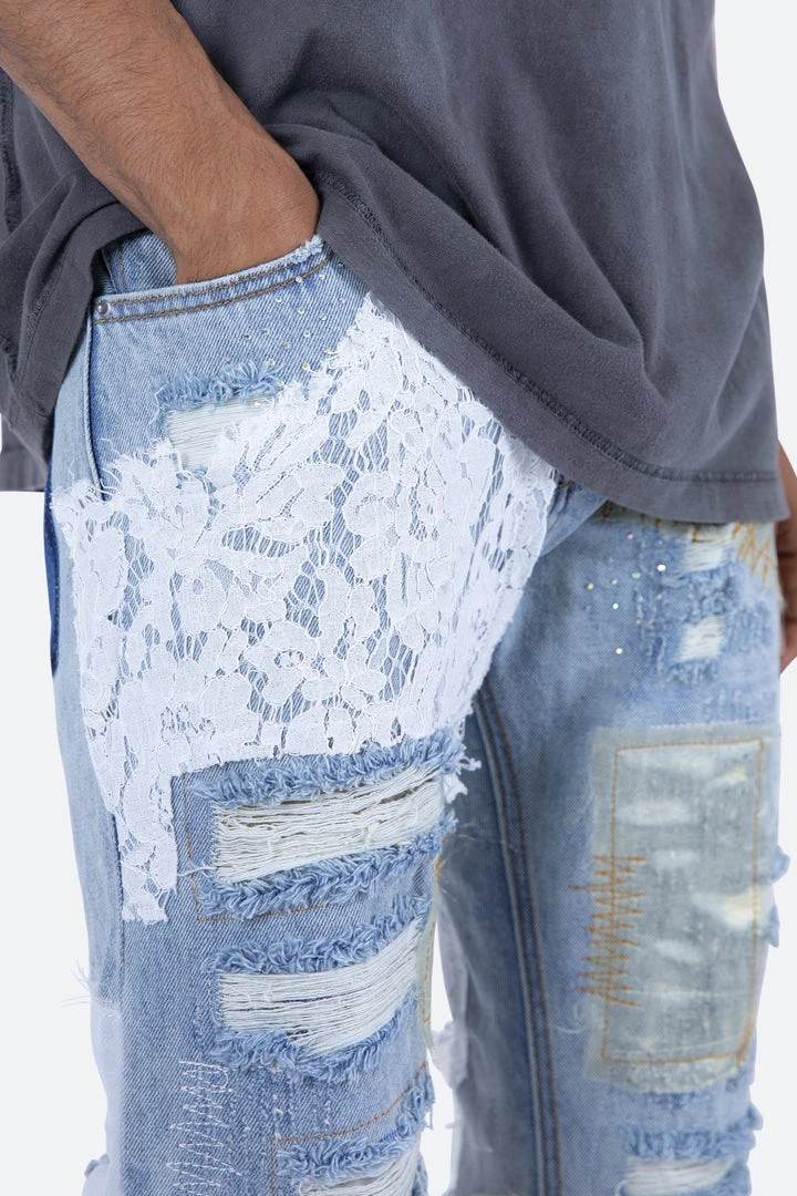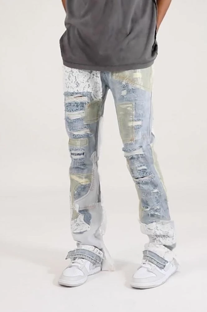 the D101 Denim is designed with our new D fit which is relaxed throughout with an extended inseam for stacking and features a base of a light wash denim, distressing and repairs throughout, fusing and lace patches throughout, rhinestone details on the wearer’s back left pocket, removed wearer’s right back pocket, and finished with lace flare details at the leg opening.