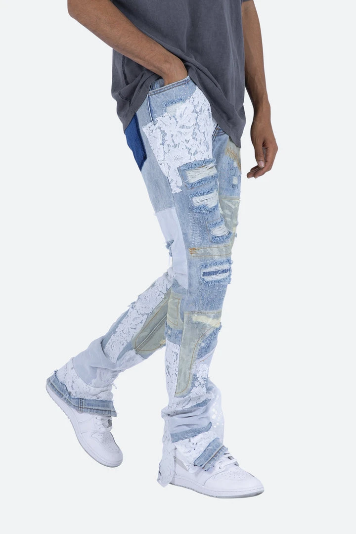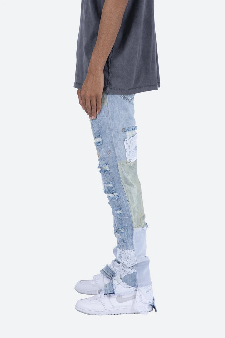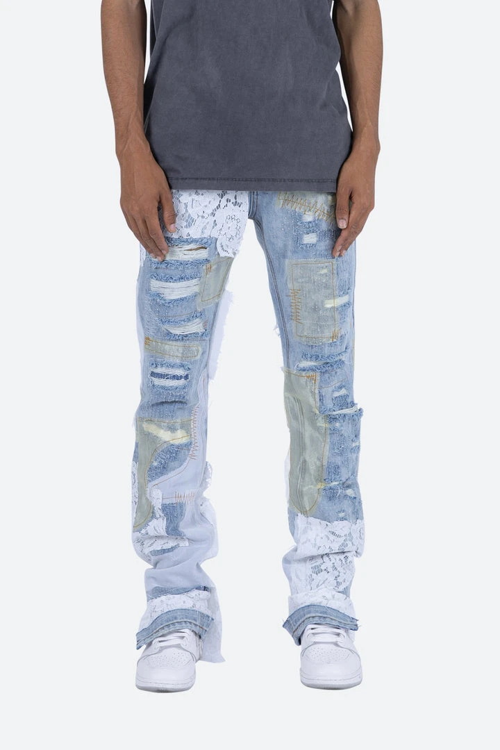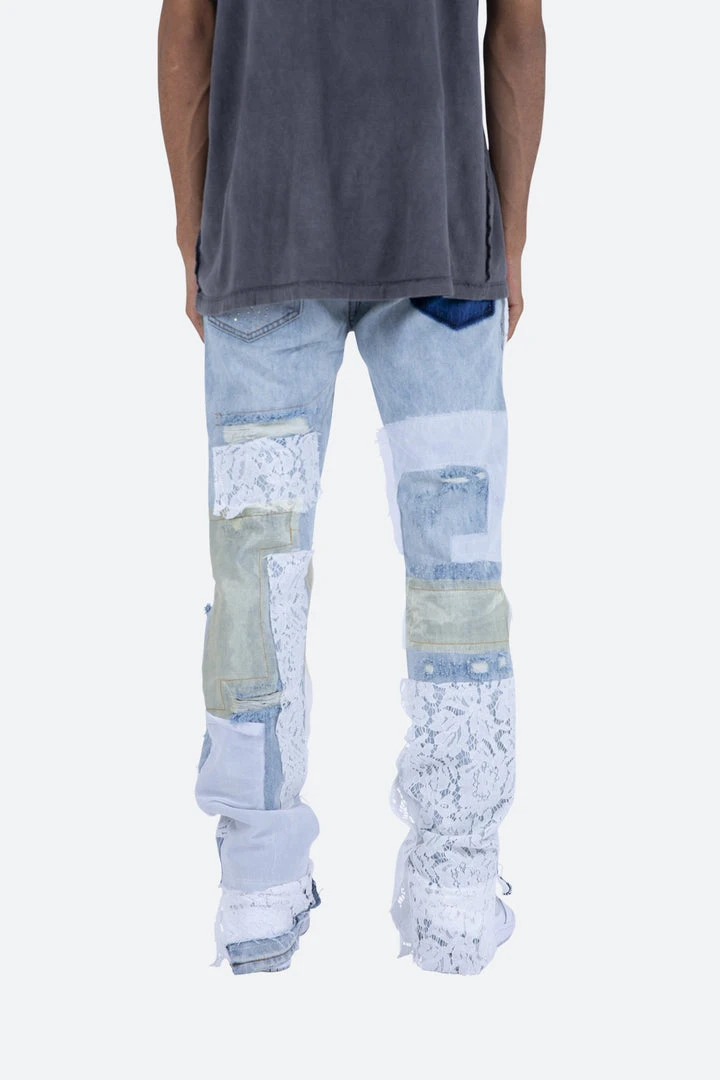 the D101 Denim is designed with our new D fit which is relaxed throughout with an extended inseam for stacking and features a base of a light wash denim, distressing and repairs throughout, fusing and lace patches throughout, rhinestone details on the wearer’s back left pocket, removed wearer’s right back pocket, and finished with lace flare details at the leg opening.