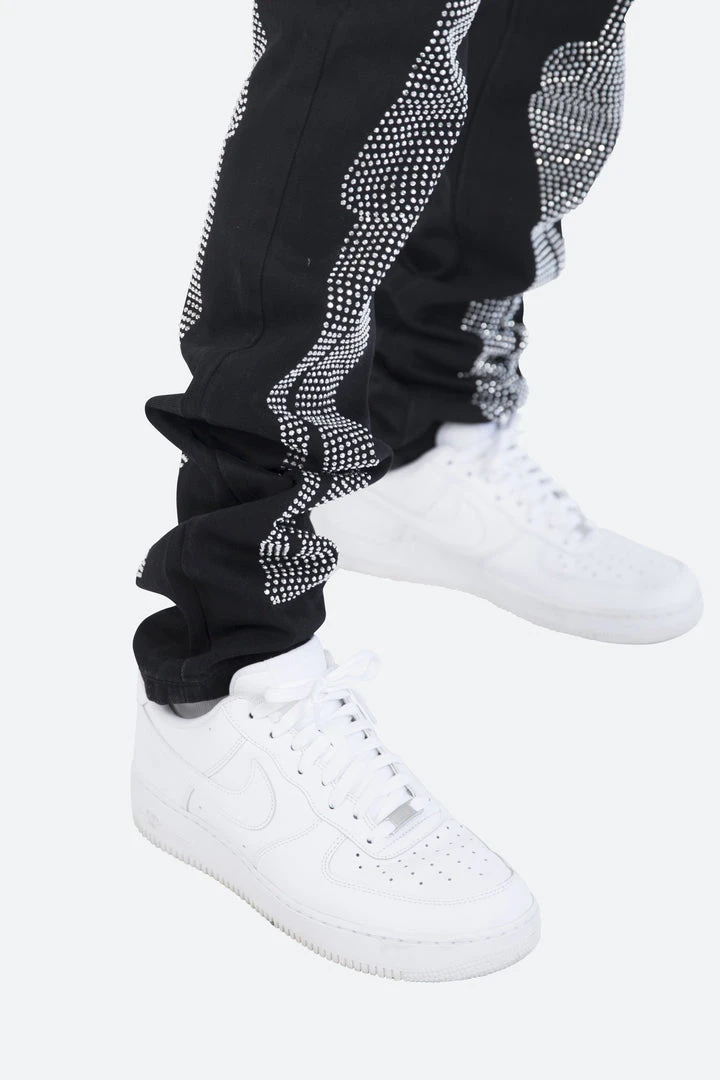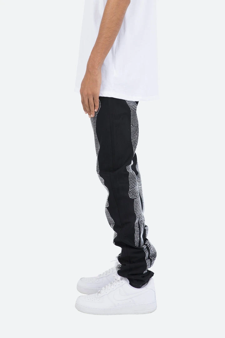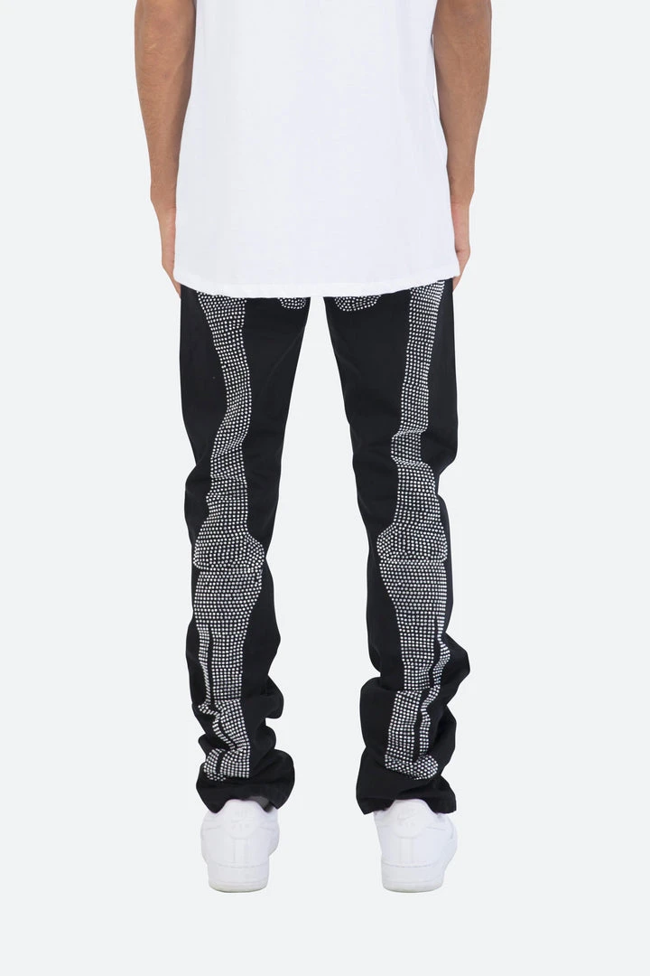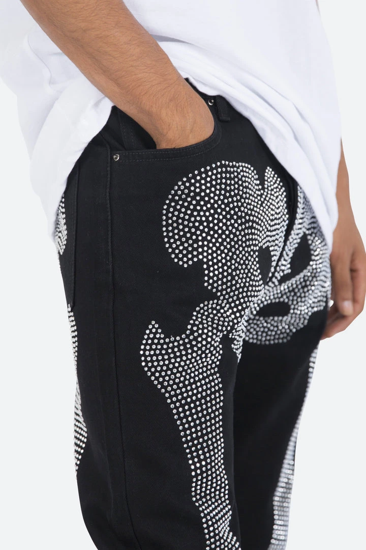 the D249 Skeleton Denim is designed with our new D fit which is relaxed throughout with an extended inseam for stacking and features skeleton artwork in rhinestones on both legs and is constructed from black denim with a raw leg opening.
