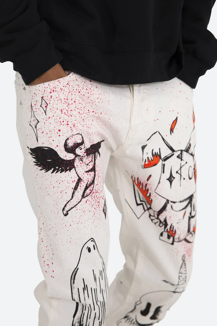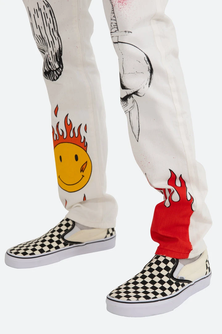 the D402 Handy Work Denim is designed with our new D fit which is relaxed throughout with an extended inseam for stacking and constructed from white denim and finished with screenprinted and painted artwork throughout.