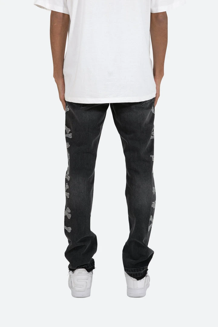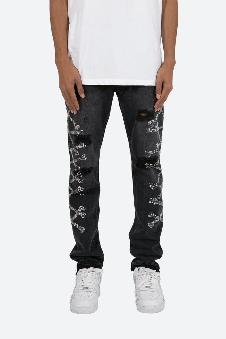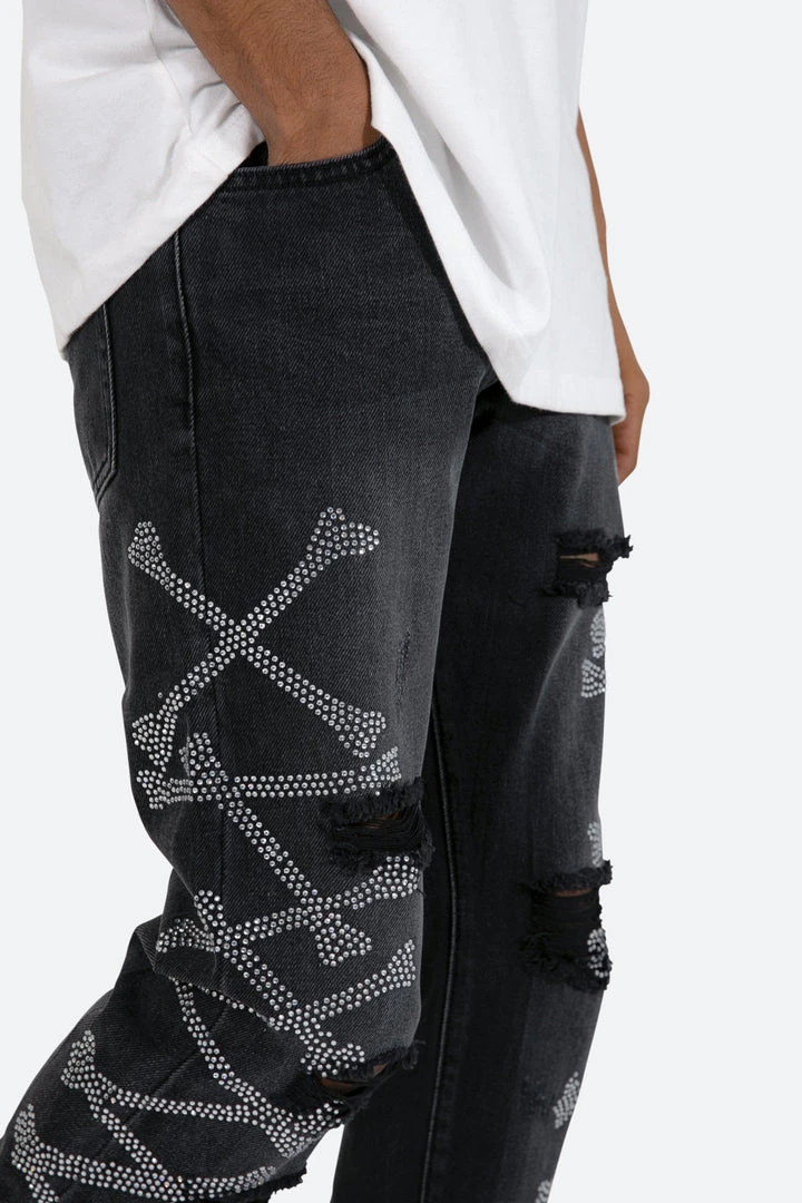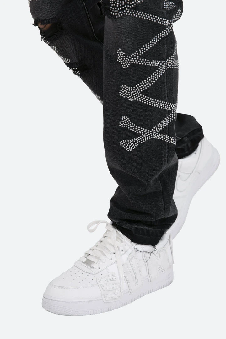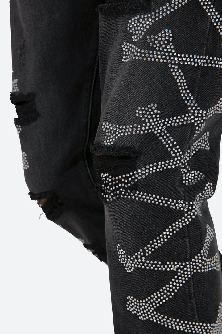the D419 Rhinestone Denim is designed with our new D fit which is relaxed throughout with an extended inseam for stacking and features bone artwork in rhinestones on the outseam of both legs and is constructed from a washed and sanded black denim.