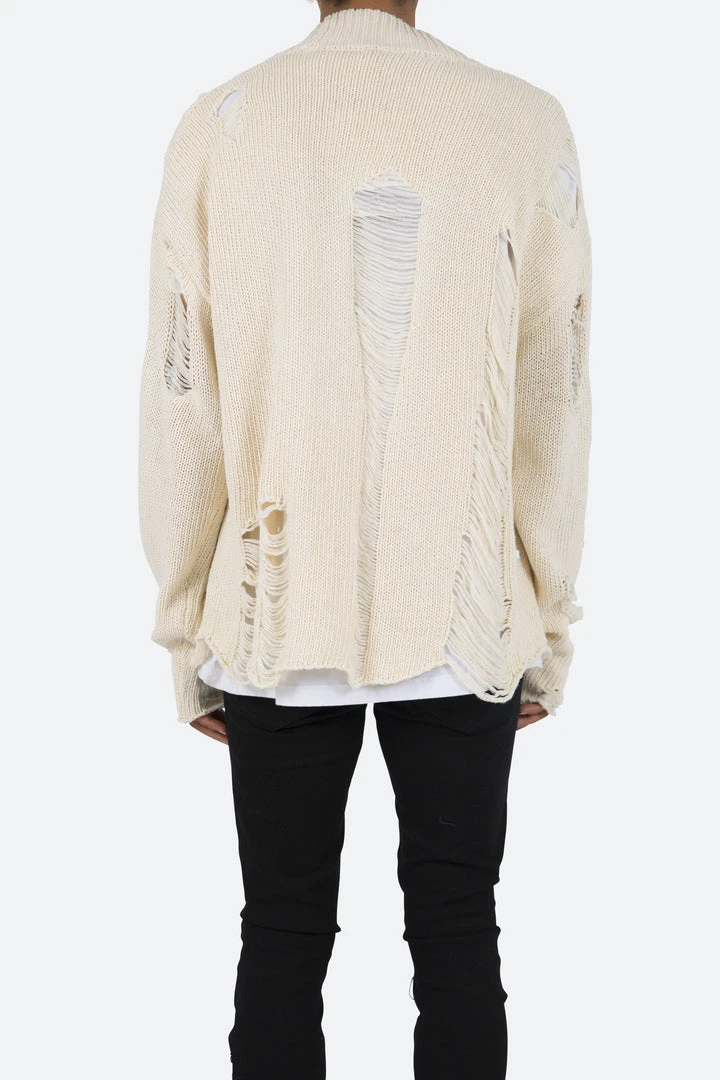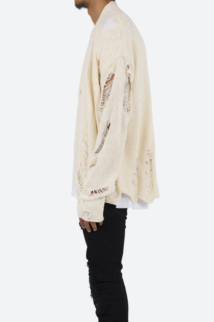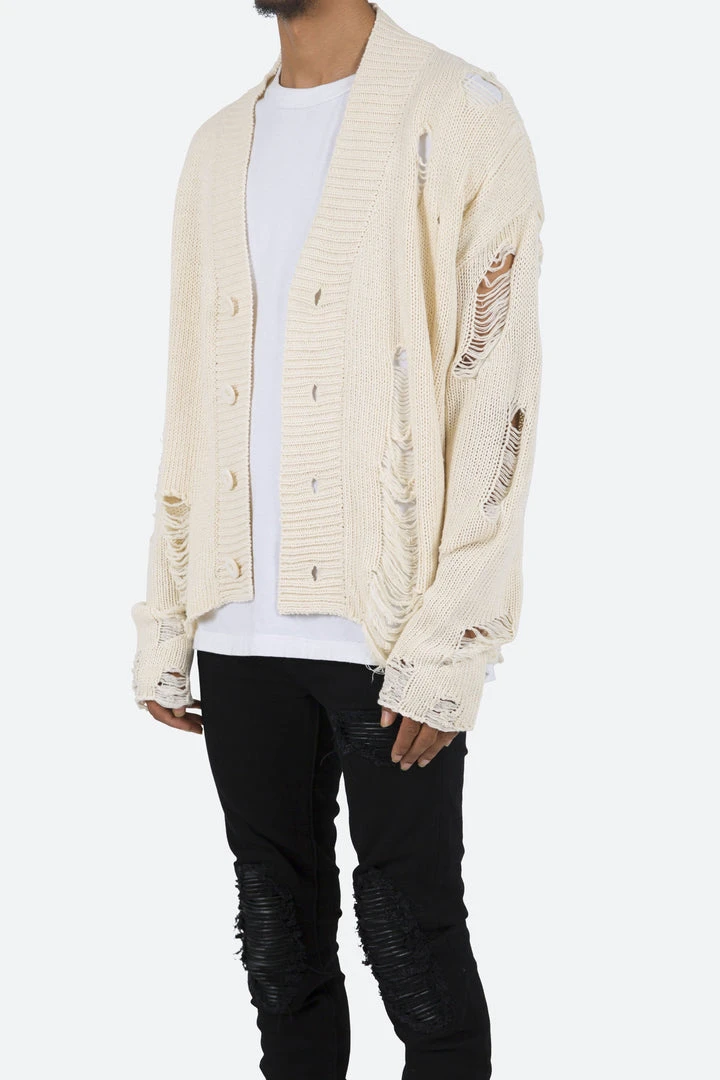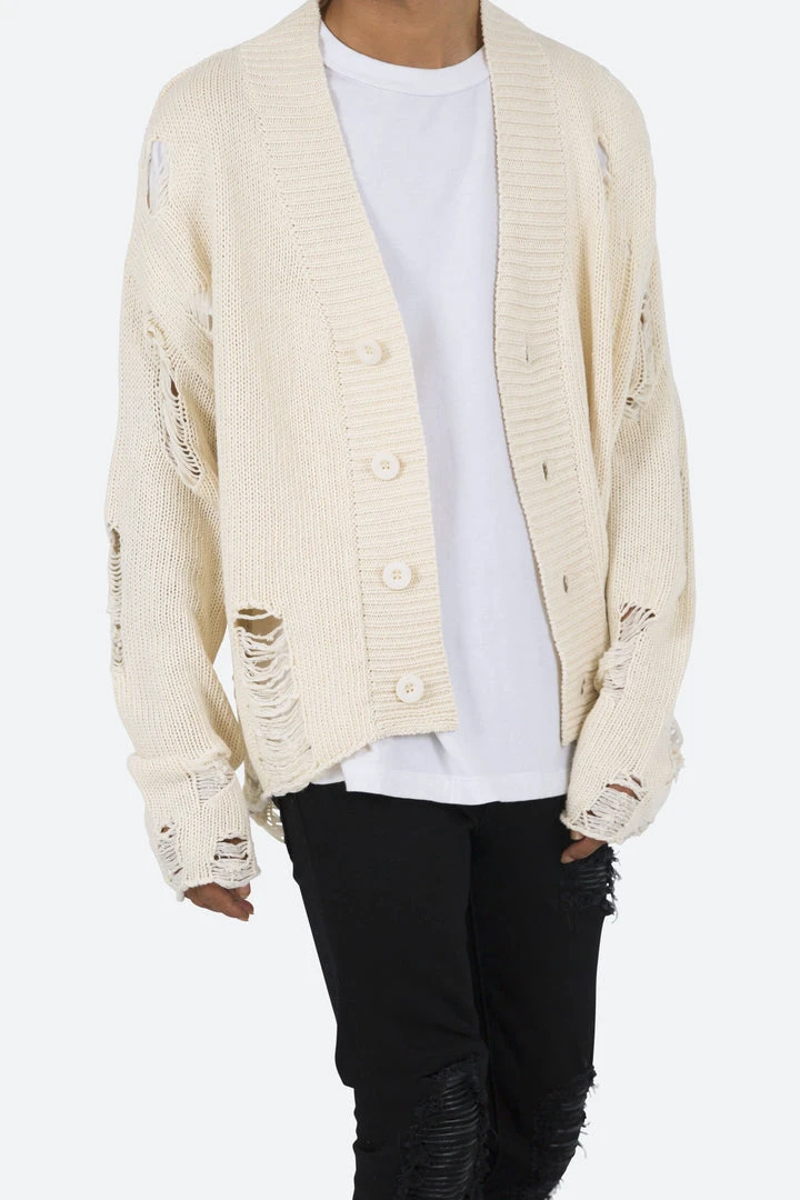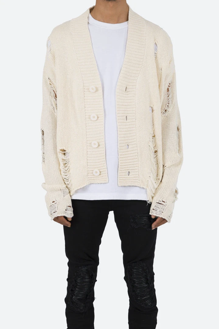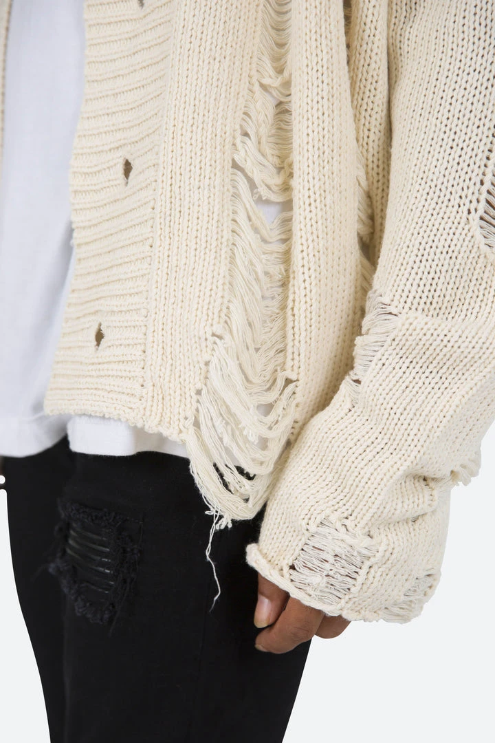 - Elevate your wardrobe with the Mnml Distressed Cardigan in Off White. This minimalist oversized sweatshirt is designed for both men and women, offering a relaxed fit and timeless style.
