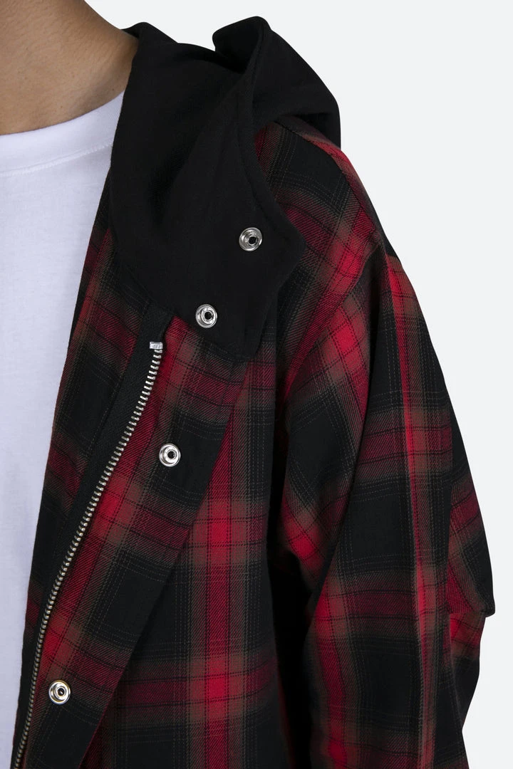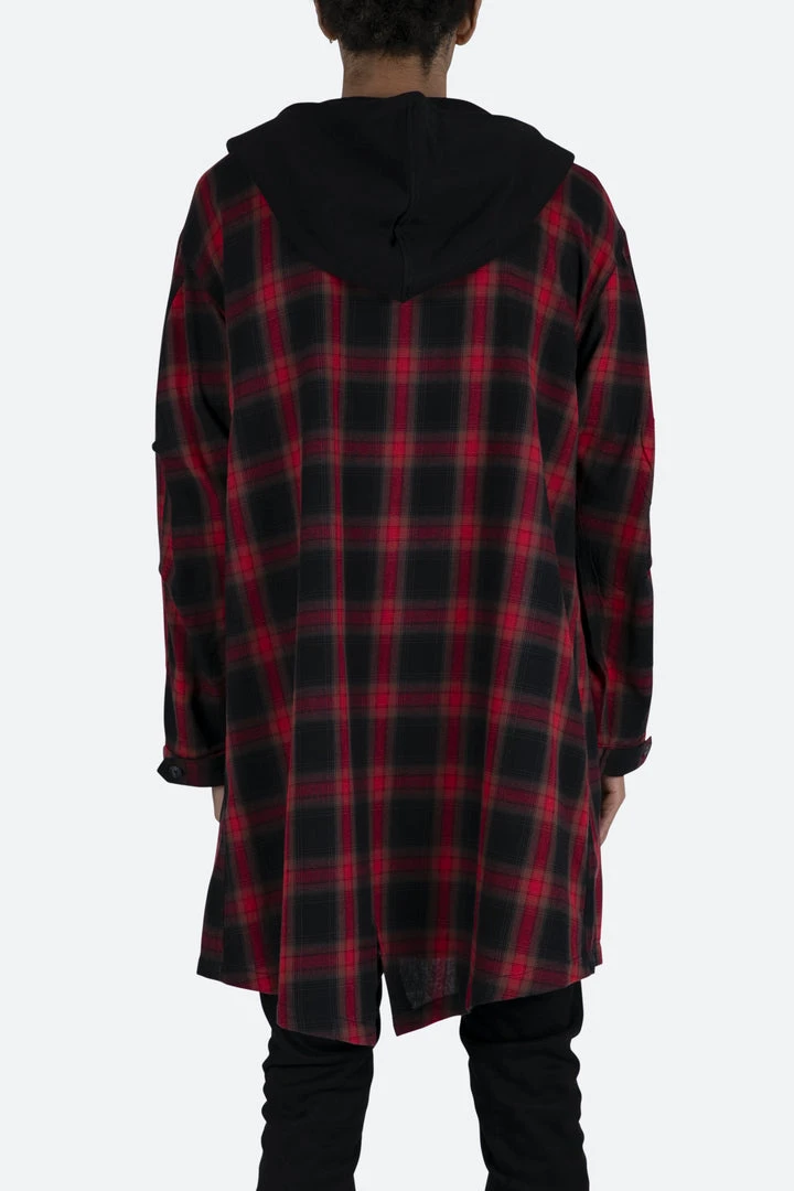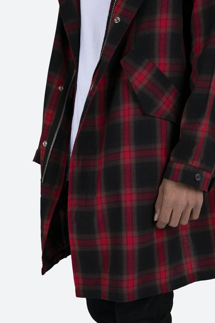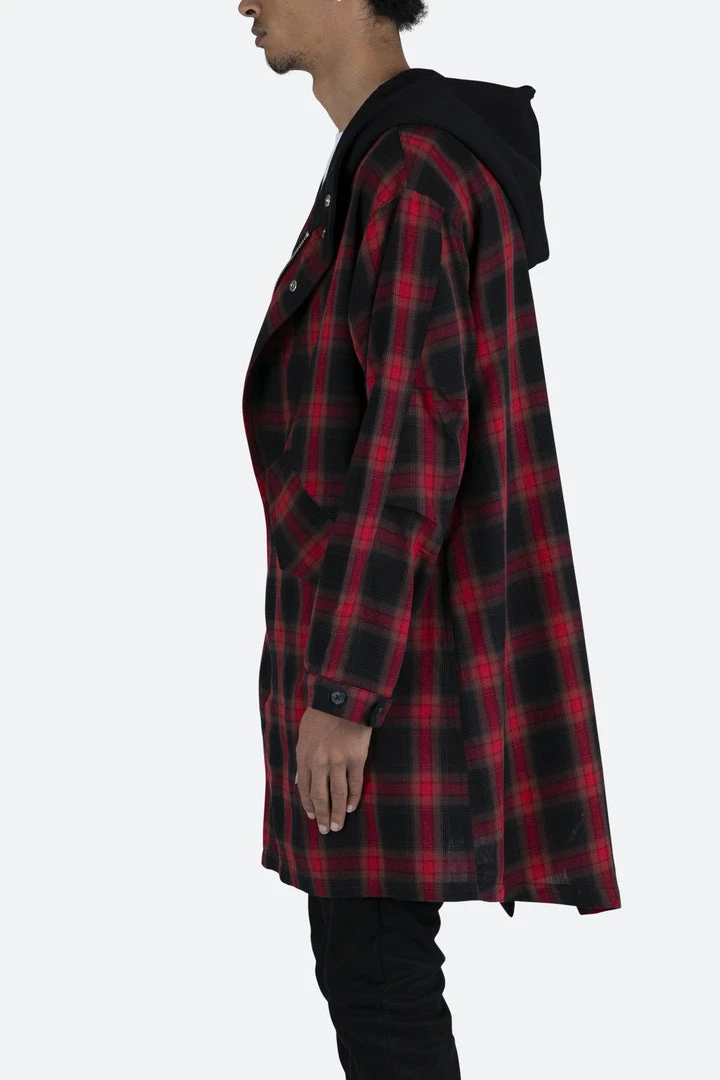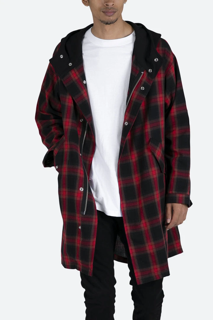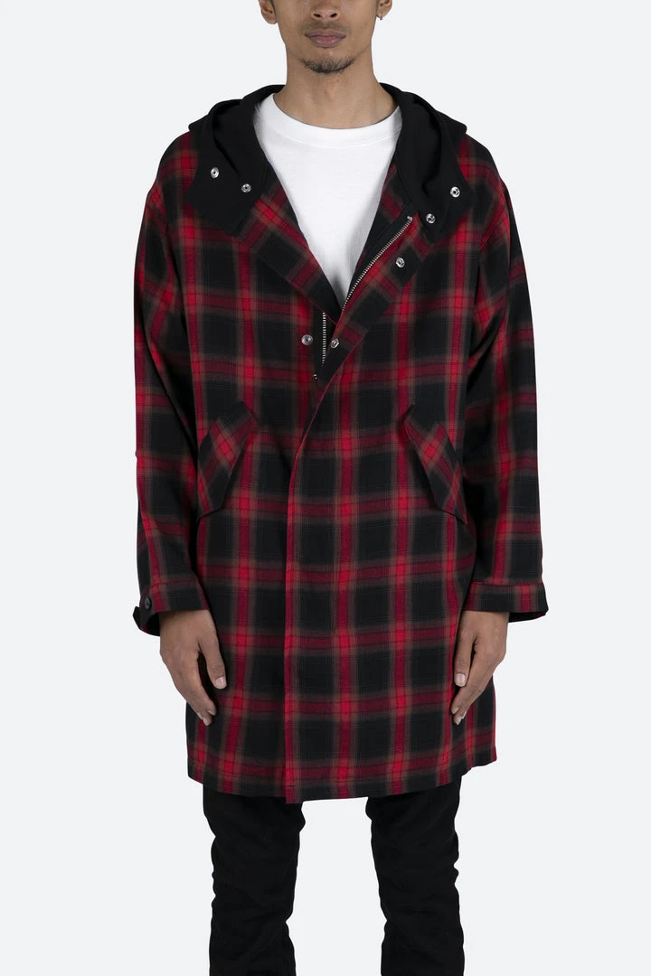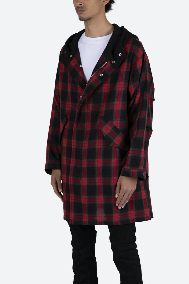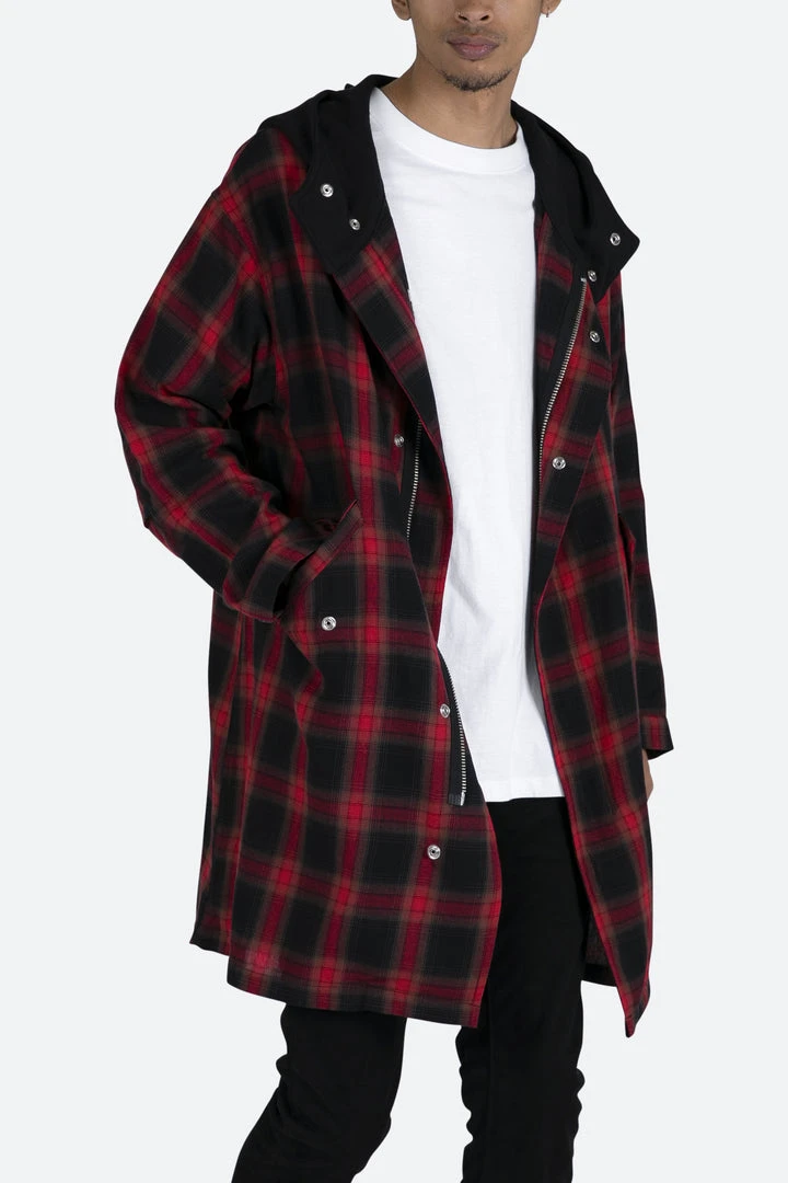 - Elevate your style with the Mnml Hooded Flannel Trench Coat in Black/Red. This versatile jacket is designed for modern men who value both fashion and functionality.