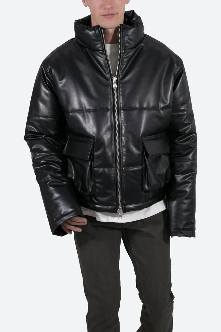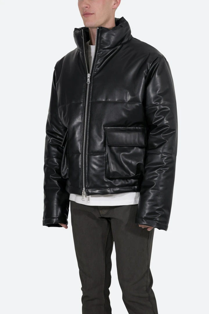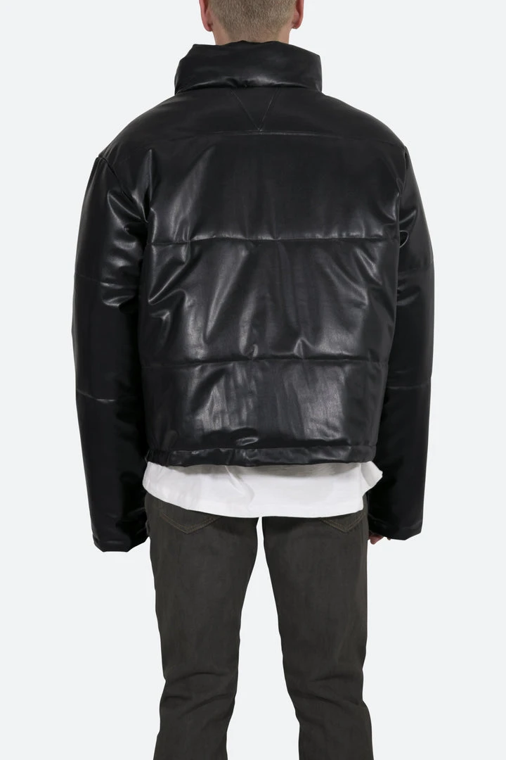 - Elevate your outerwear game with the Mnml Leather Cropped Puffer Jacket in Black. Designed for both men and women, this jacket combines style and functionality for a modern look.