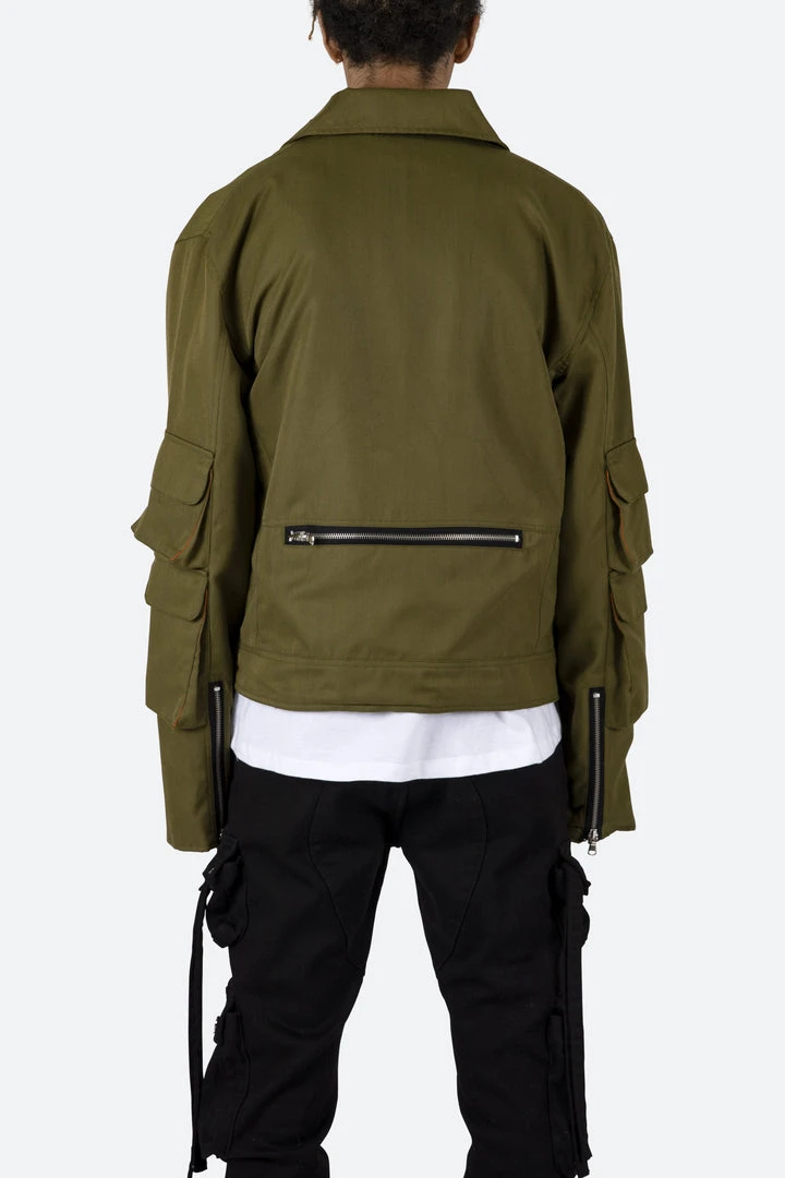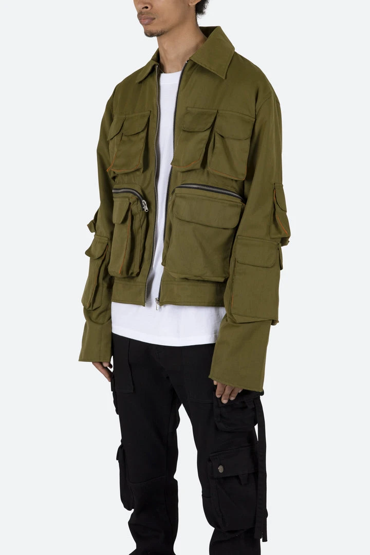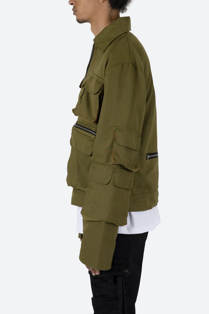 the Lightweight Cargo Jacket is designed with a relaxed fit and features a zipper placket, cargo pockets on the front with both snap and zipper closures, cargo pockets on the sleeves, zipper details at the arm openings, and finished with a zipper pocket on the back.