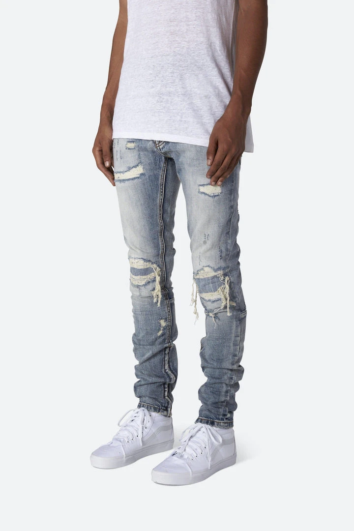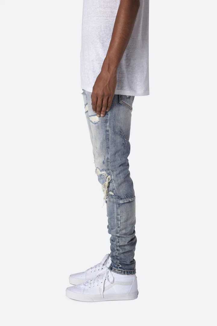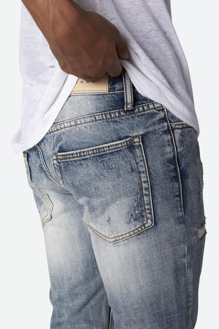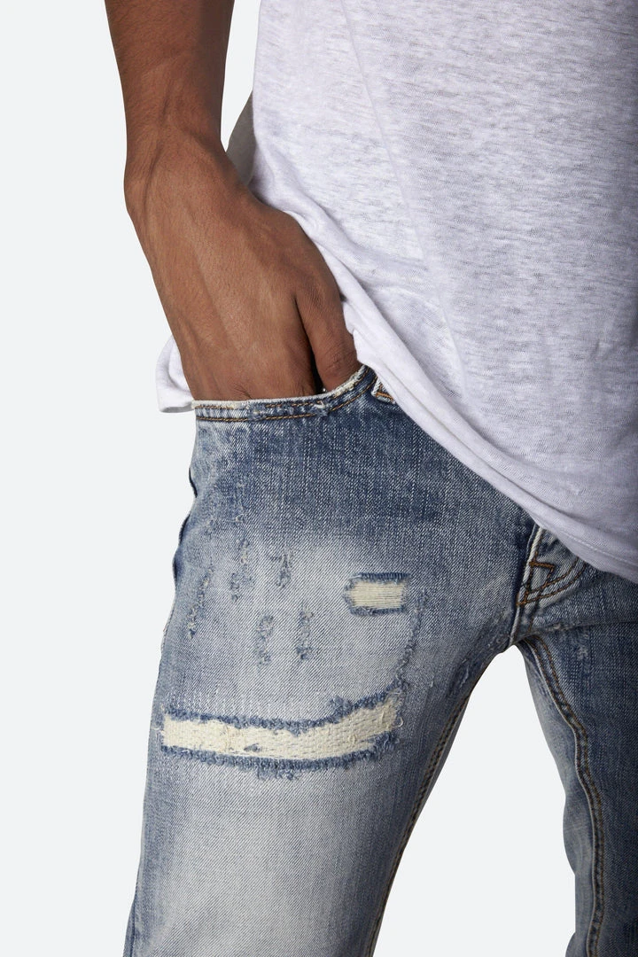 - Elevate your style with the Mnml M1 Repaired Slim Denim in Blue. Designed for the modern man, these jeans feature a slim fit and unique repaired detailing for a trendy, edgy look.