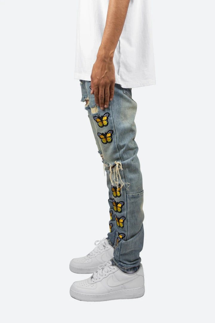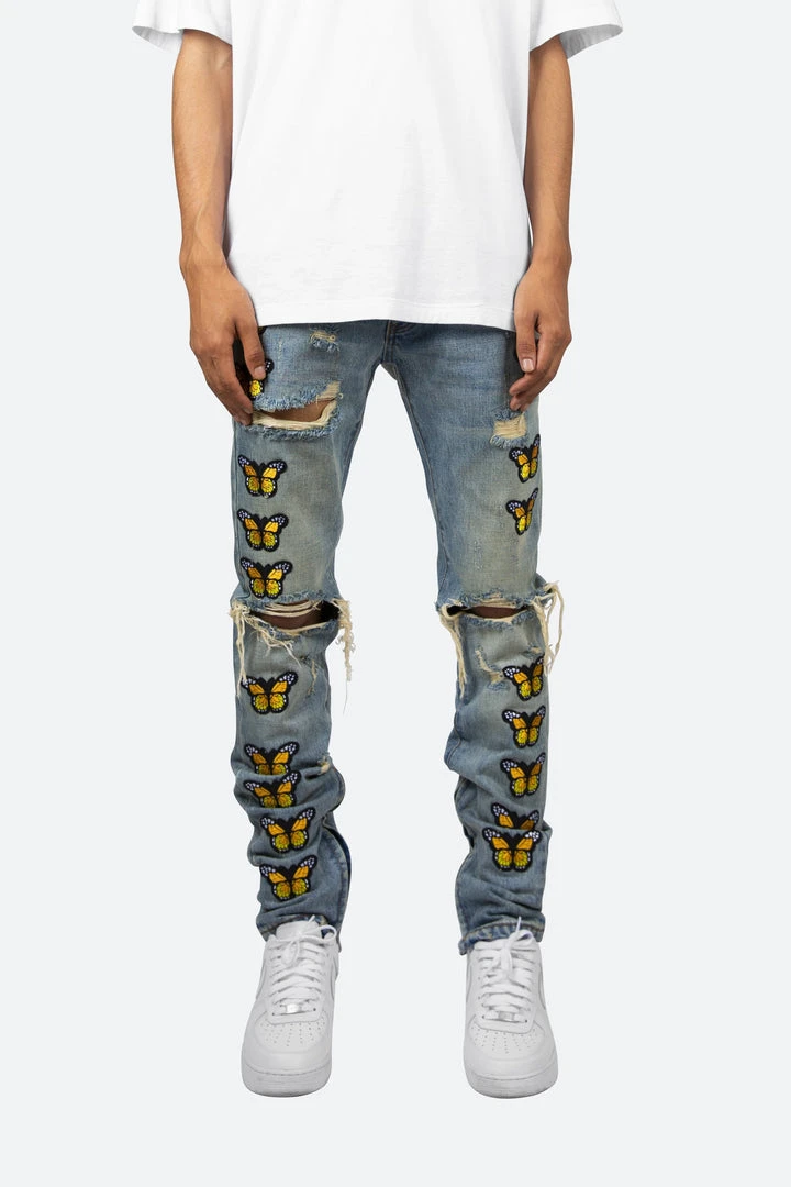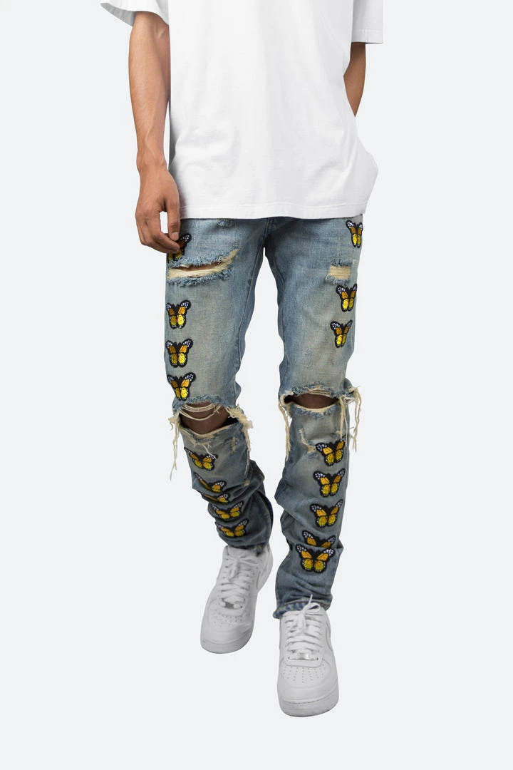The M188 Butterfly Denim is designed with a relaxed fit through the thigh that tapers from the knee to the ankle, featuring distress details at the knee and thigh, embroidered butterfly patches on both legs, and finished off with a 10″ concealed zipper on the inseam for a carefully optimized fit.