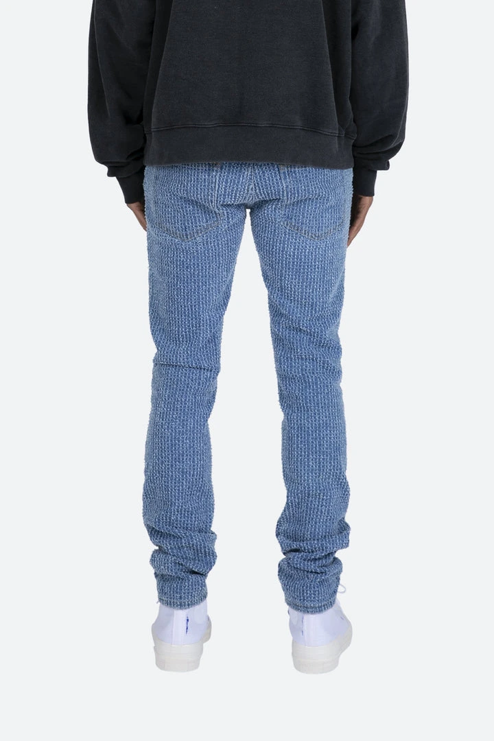 - Elevate your wardrobe with the Mnml M308 Jacquard Slim Denim Jeans in Blue. Designed for a modern, slim fit, these jeans offer a sleek and stylish look that complements any outfit.