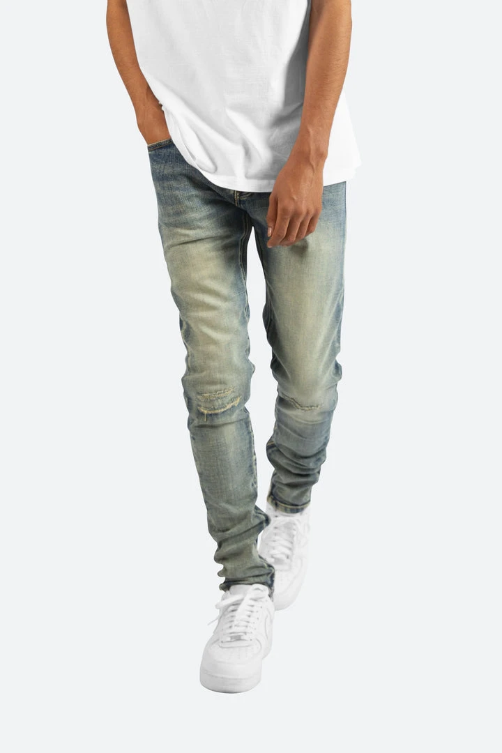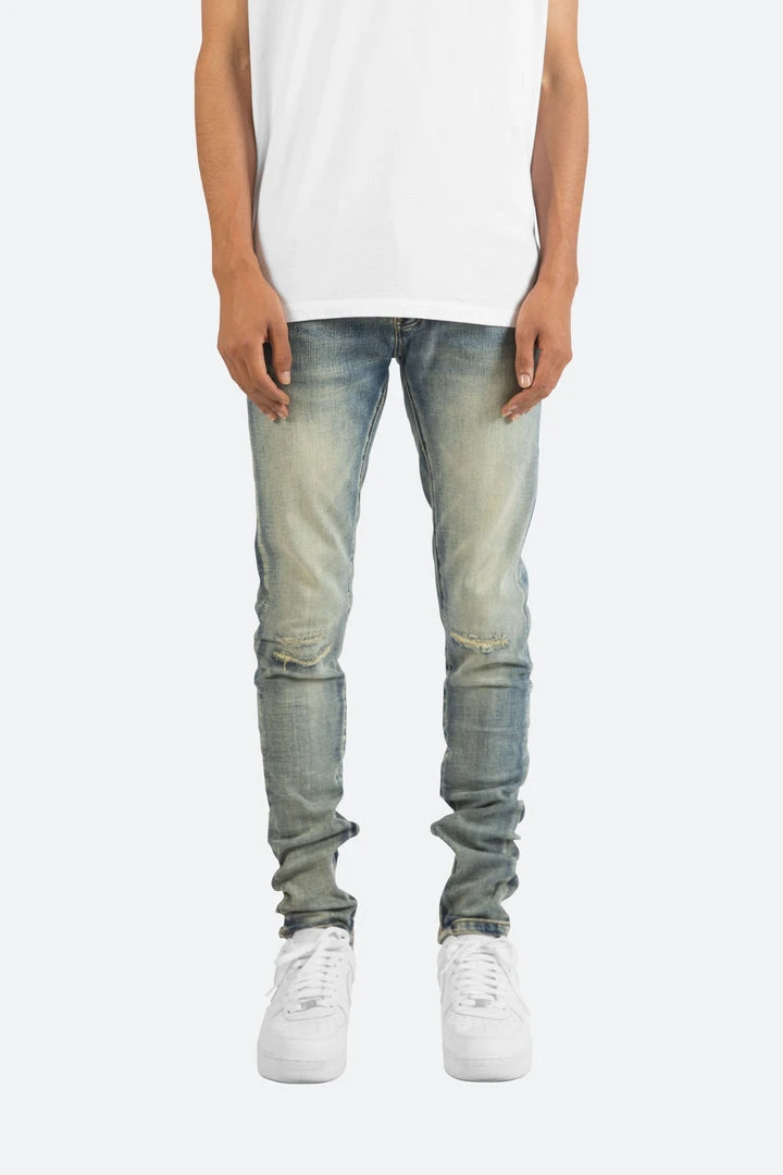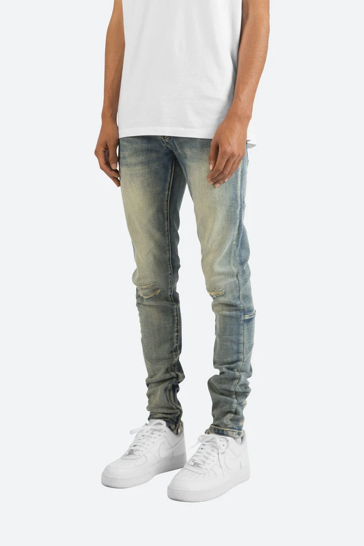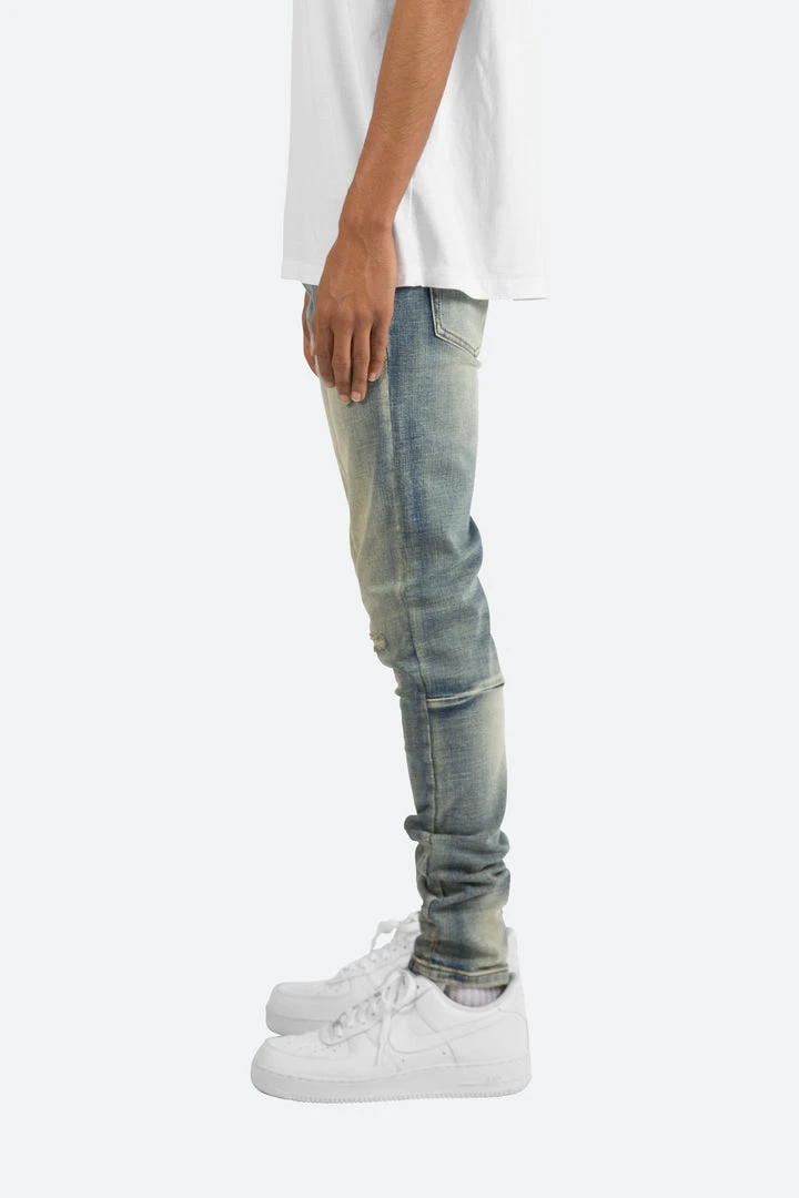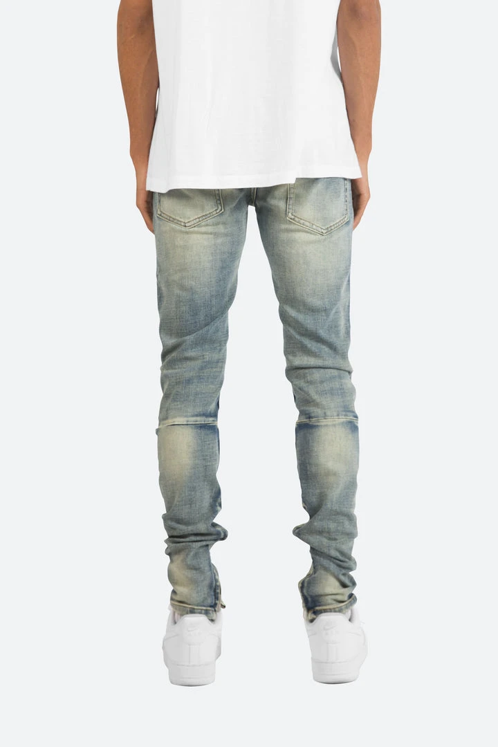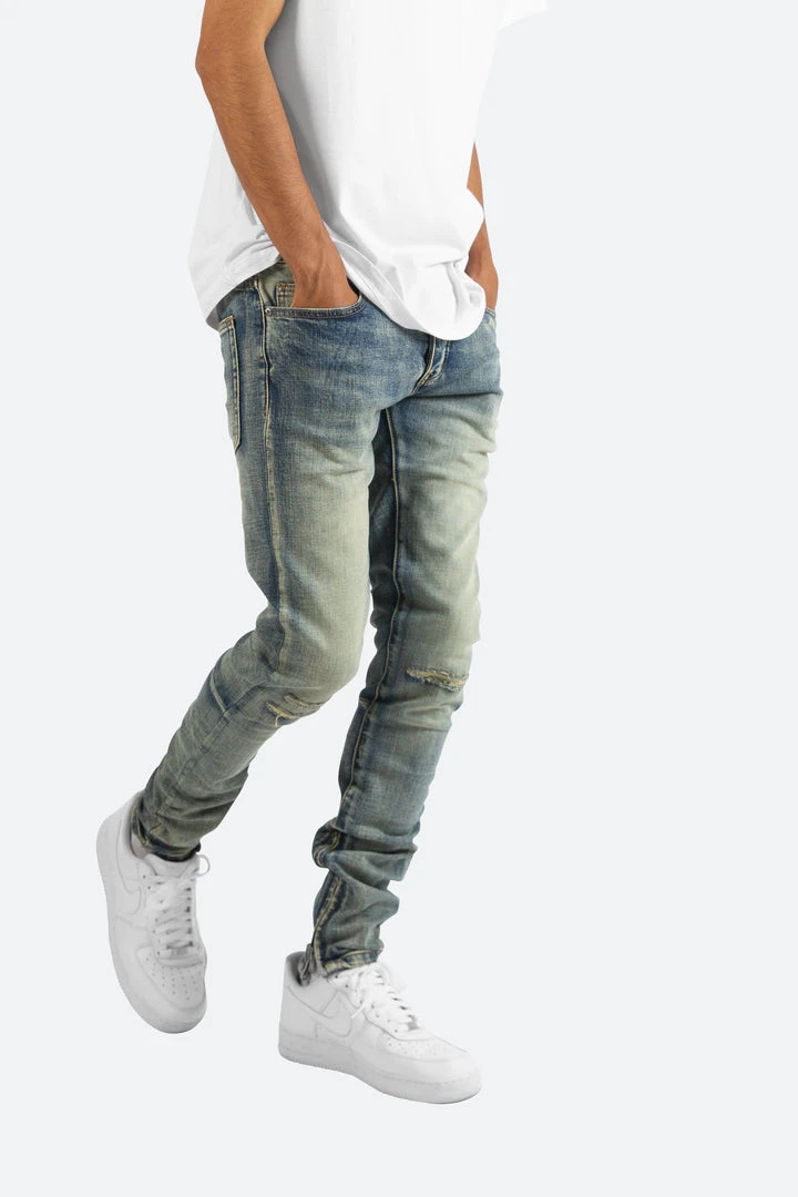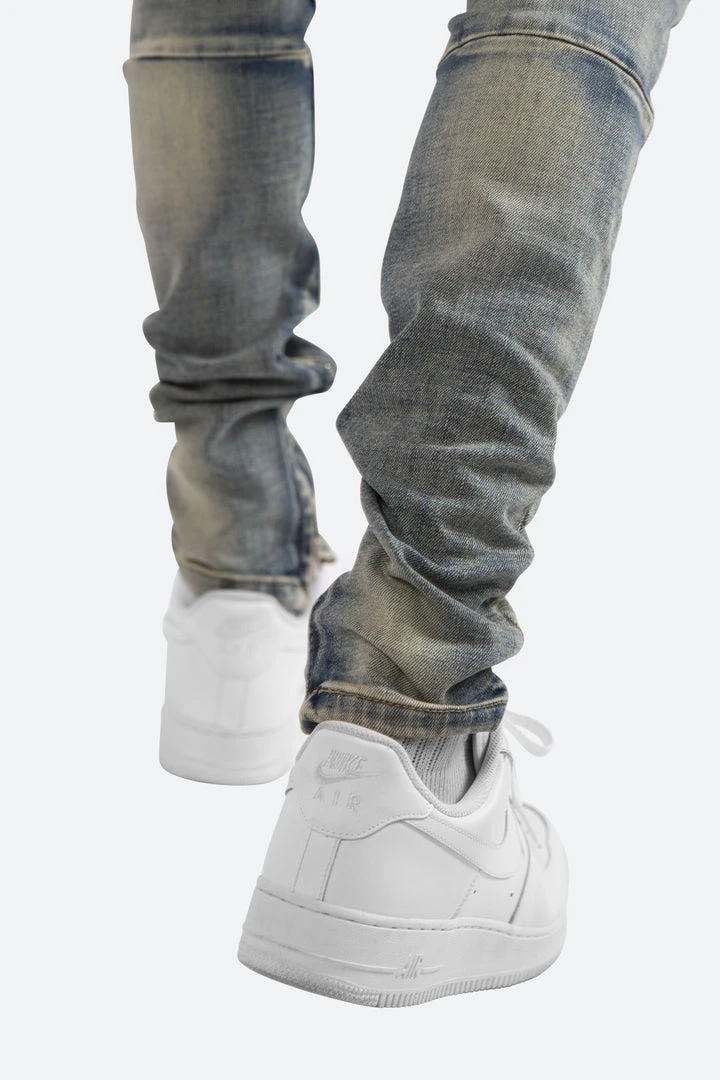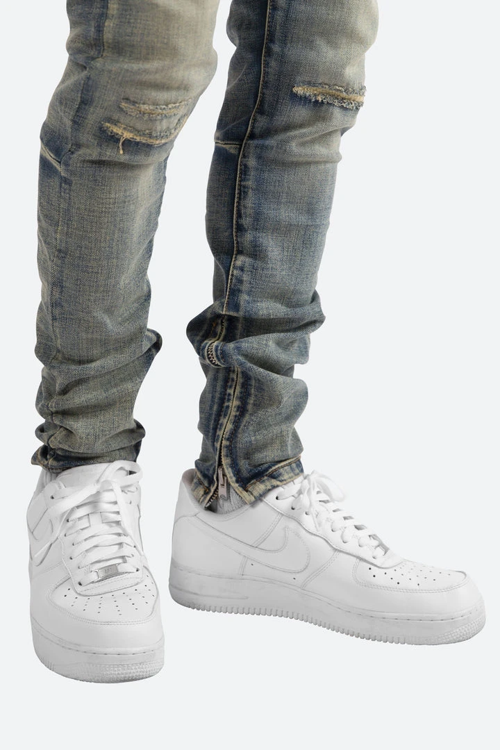 developed in los angeles, the blue m34 denim is designed with a relaxed fit through the thigh that tapers from the knee to the ankle, with distressed-and-repaired details at the knees and a medium wash throughout, finishing off with a 10″ concealed zipper on the inseam and a rear calf panel for a carefully optimized fit.