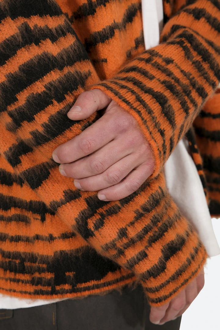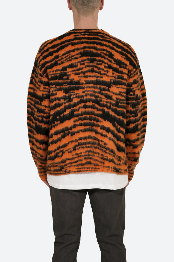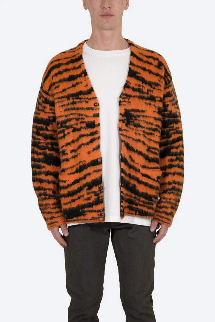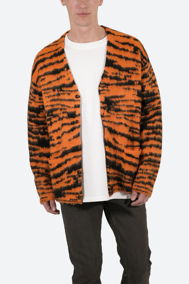 - Stay trendy and comfortable with the Mnml Mohair Zebra Cardigan Sweater. Featuring a unique zebra pattern in vibrant orange and black, this cardigan is perfect for adding a bold statement to your wardrobe.