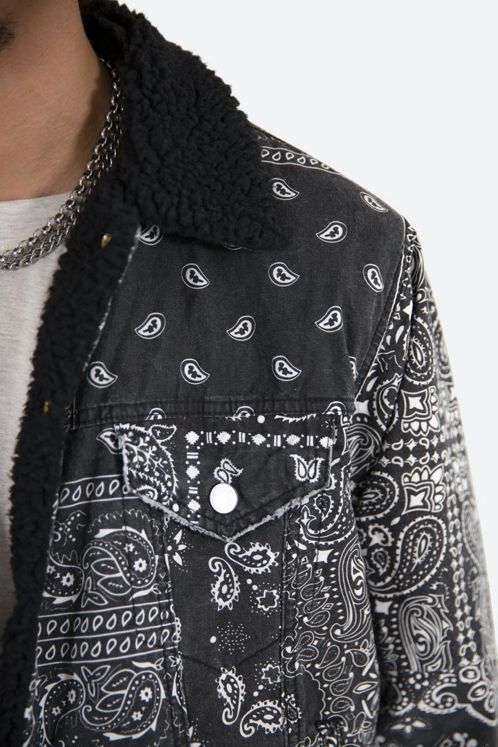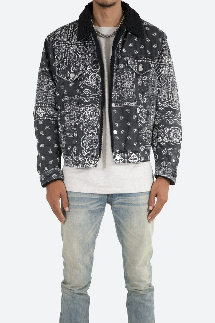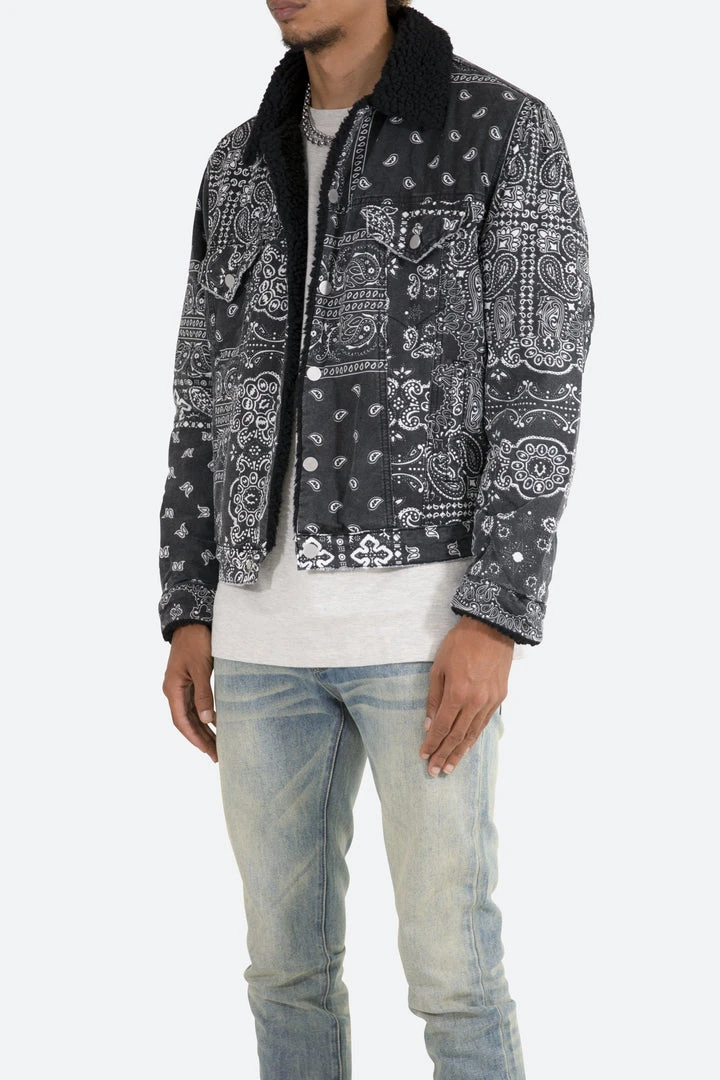 - Stay cozy and fashionable this winter with the Mnml Outerwear Bandana Sherpa Trucker Jacket in Black. Designed for men who value both style and comfort.