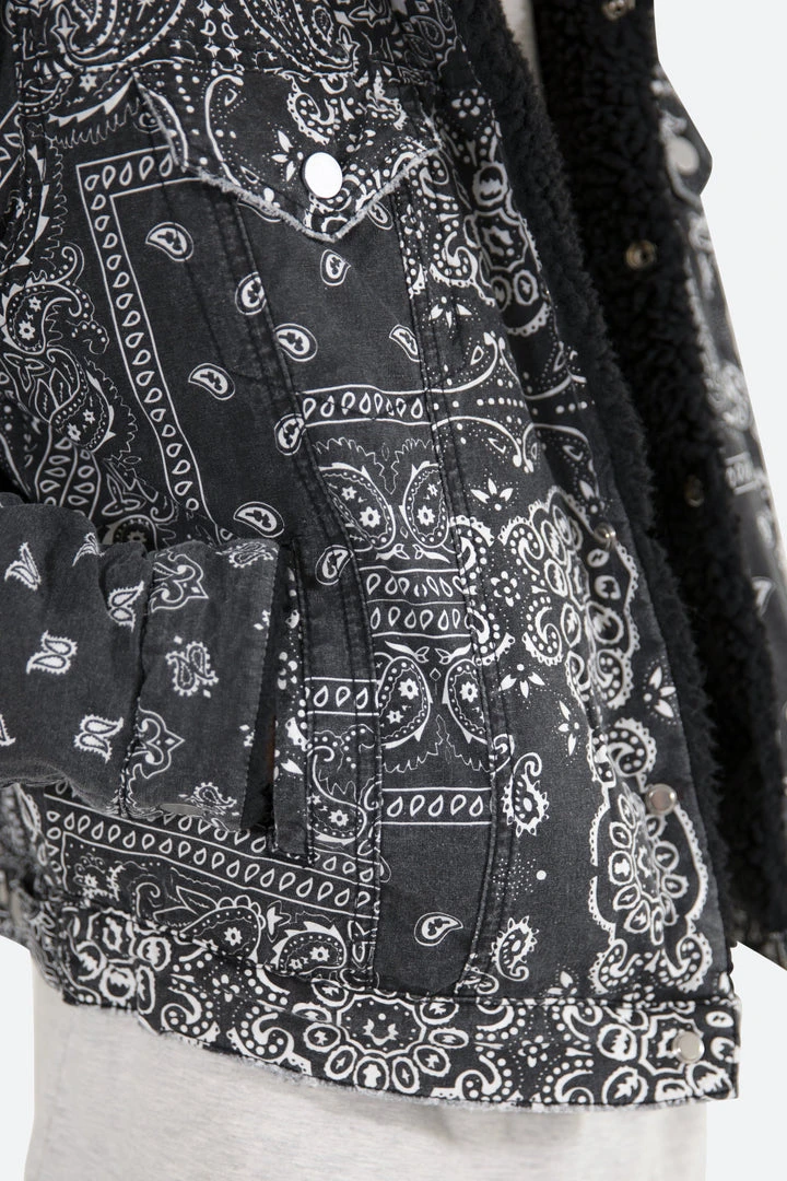 - Crafted with premium materials, this jacket features a soft sherpa lining and a classic bandana print, making it a versatile addition to your wardrobe.
