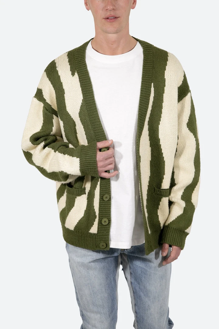 - Elevate your casual wardrobe with the Mnml Outerwear Zebra Cardigan in Green/White. This trendy sweatshirt features a unique zebra stripe design, making it a standout piece for any outfit.