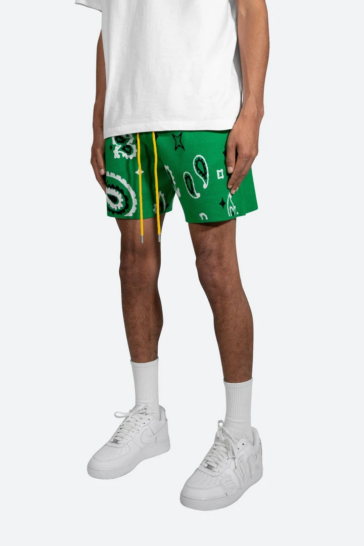- Elevate your style with the Mnml Paisley Knit Shorts in Green. These trendy shorts feature a unique paisley knit design, offering a perfect blend of fashion and comfort.