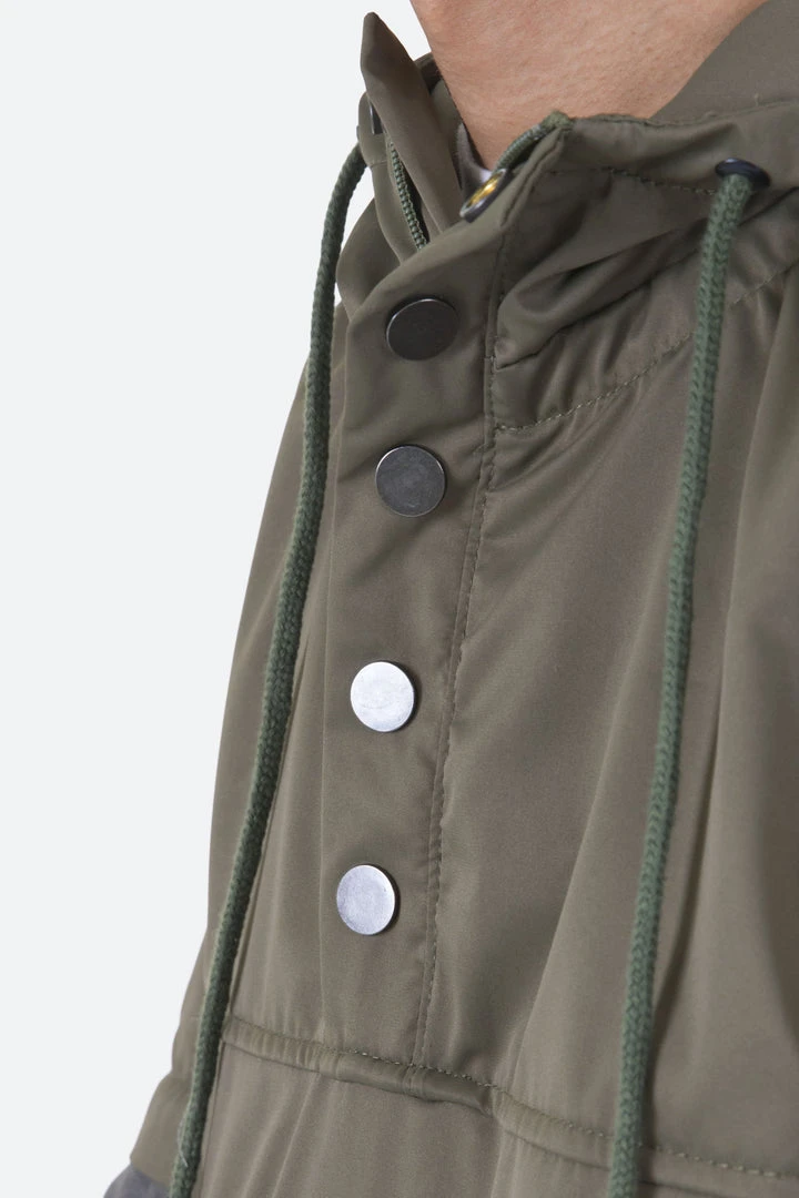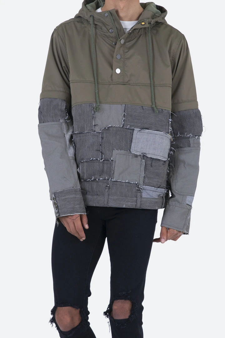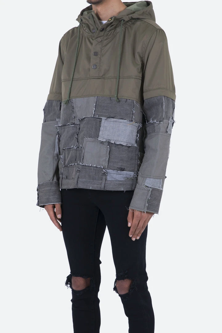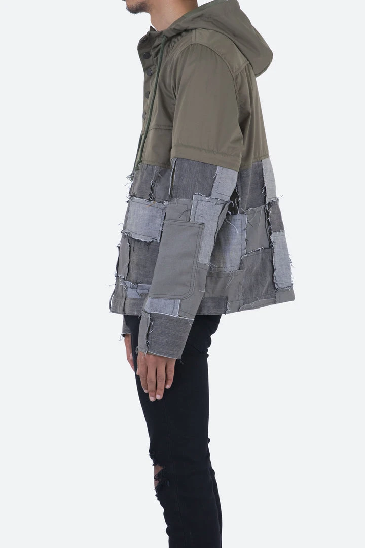 the Patchwork Anorak Jacket is designed with a relaxed fit and features a body constructed from patchwork denim body in grey tones, upper constructed from a custom nylon fabric with classic anorak details, metal snap closures on the placket and finished with tonal cotton drawcords on the hood.