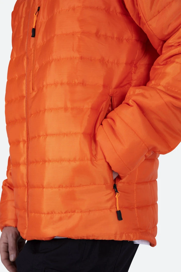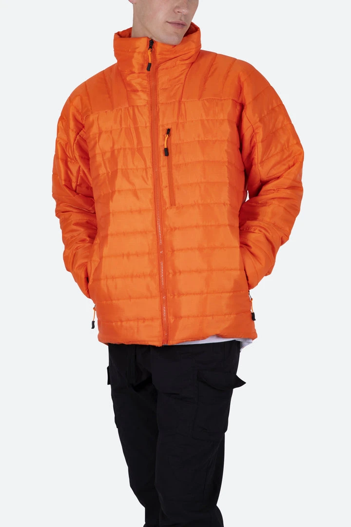 - Crafted with high-quality materials, the Mnml Quilted Jacket features a sleek quilted design and a vibrant orange color, making it a standout piece in any wardrobe.