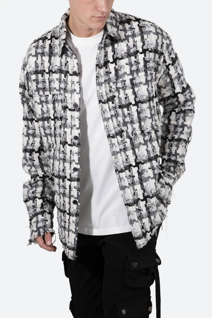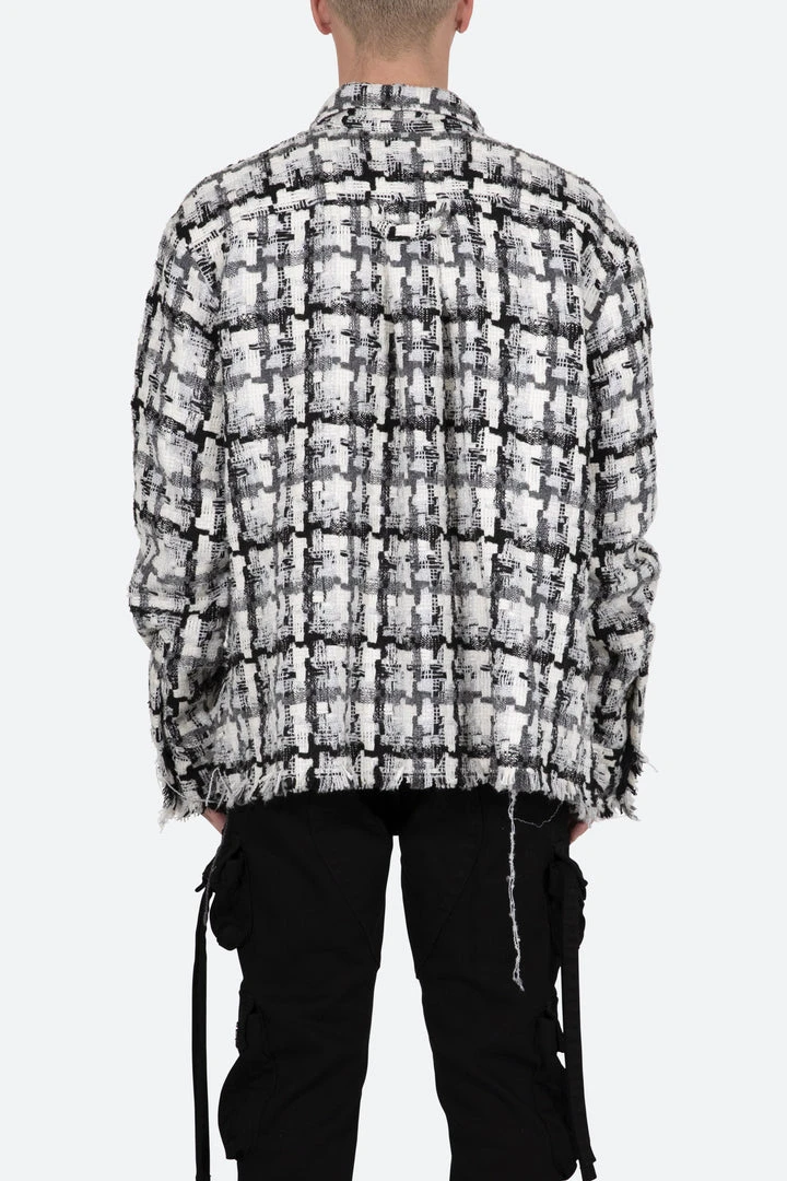 - Featuring a unique raw edge design, this flannel shirt stands out with its modern, minimalist aesthetic. The grey and white color combination ensures versatility in your wardrobe.