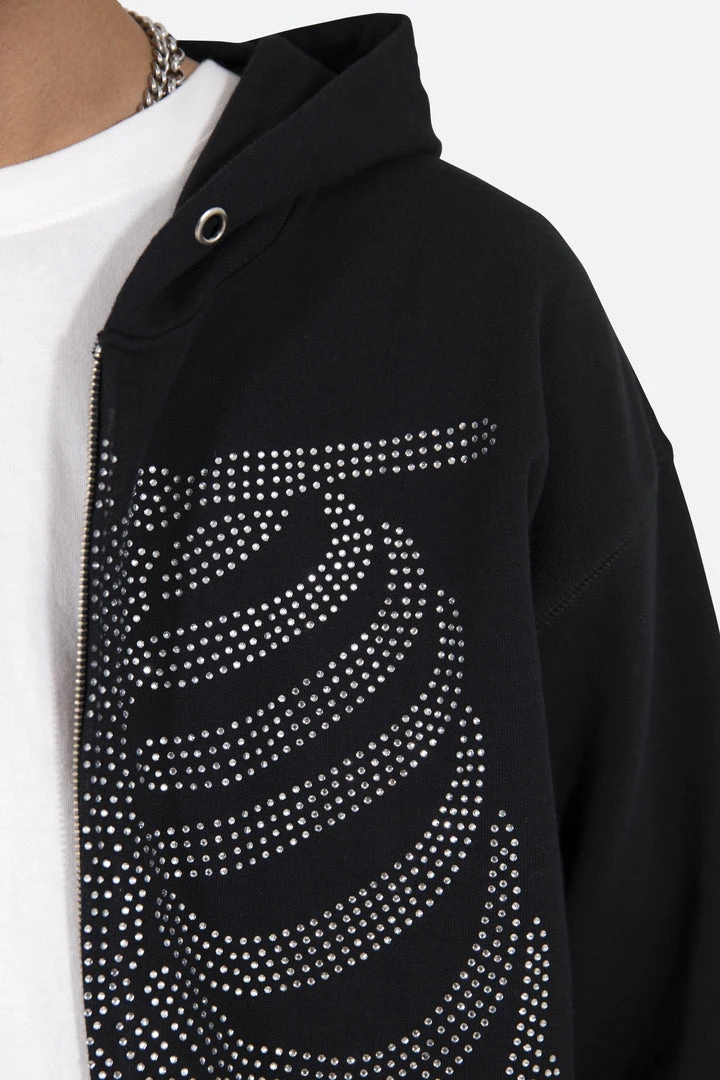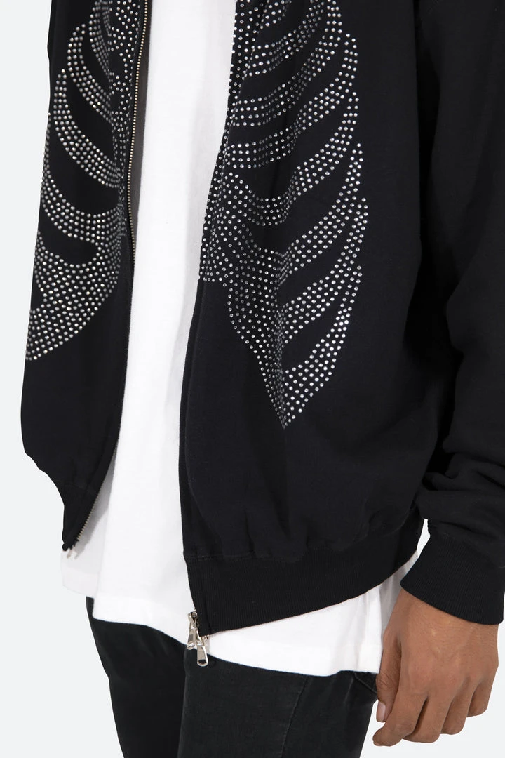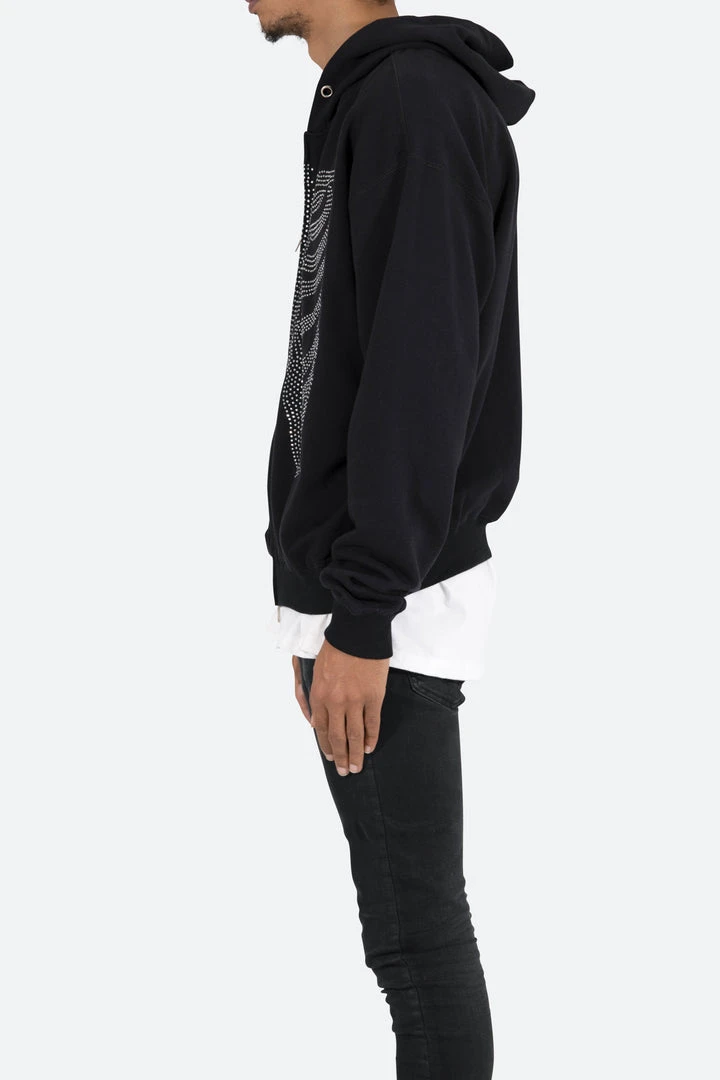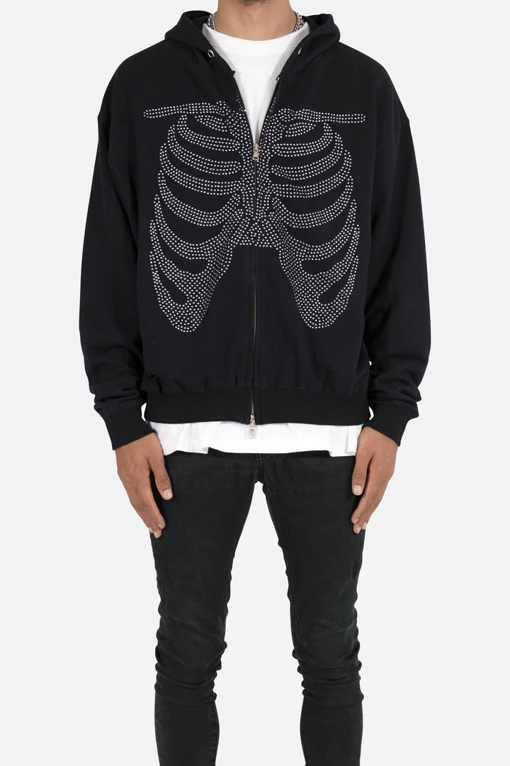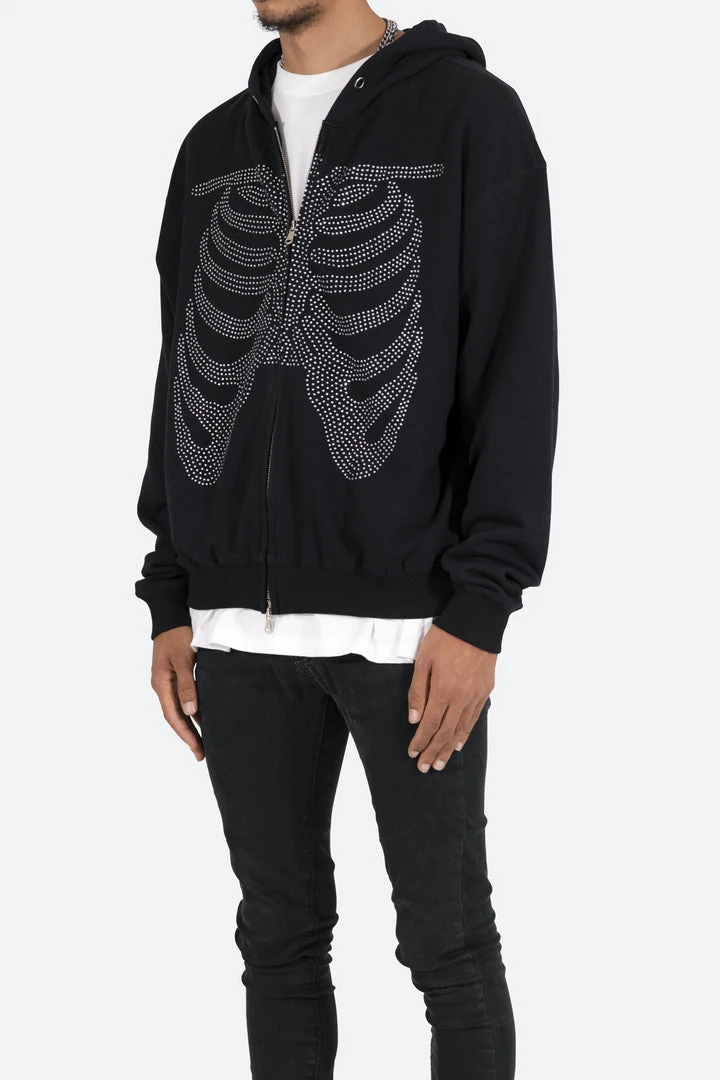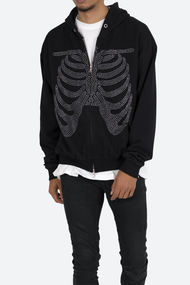 - Elevate your style with the Mnml Rhinestone Skeleton Zip Up Hoodie in Black. This trendy hoodie features a unique rhinestone skeleton design, making it a standout piece in your outerwear collection.