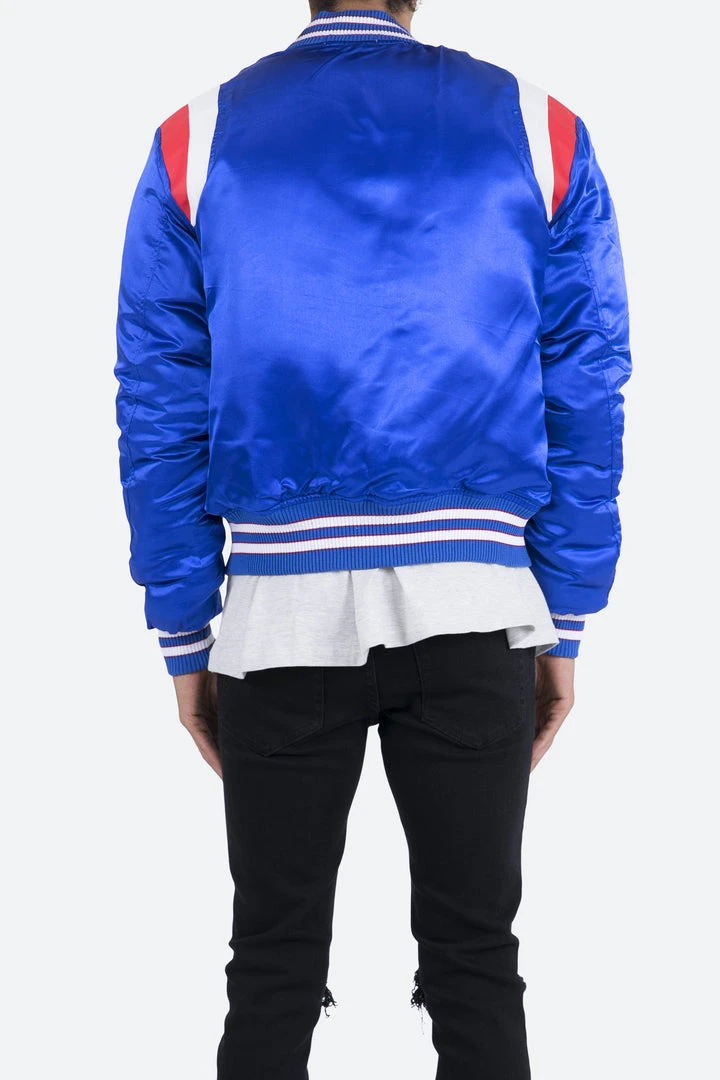 - Elevate your wardrobe with the Mnml Teddy Bomber Jacket in Blue/Red. This versatile outerwear piece is designed for both men and women, offering a perfect blend of style and comfort.