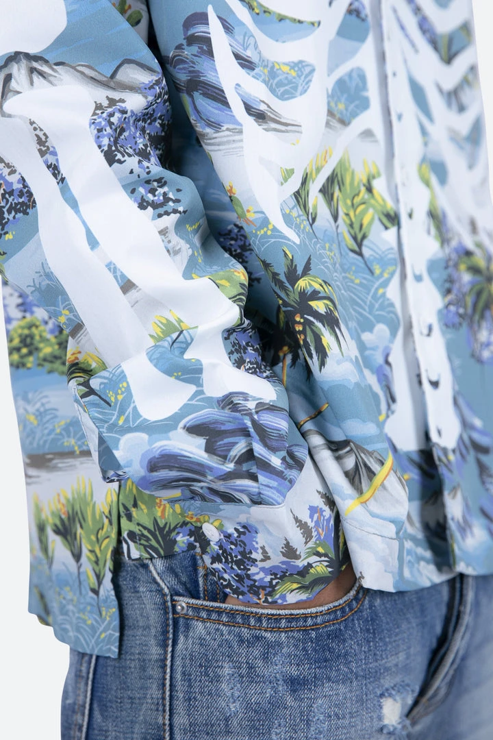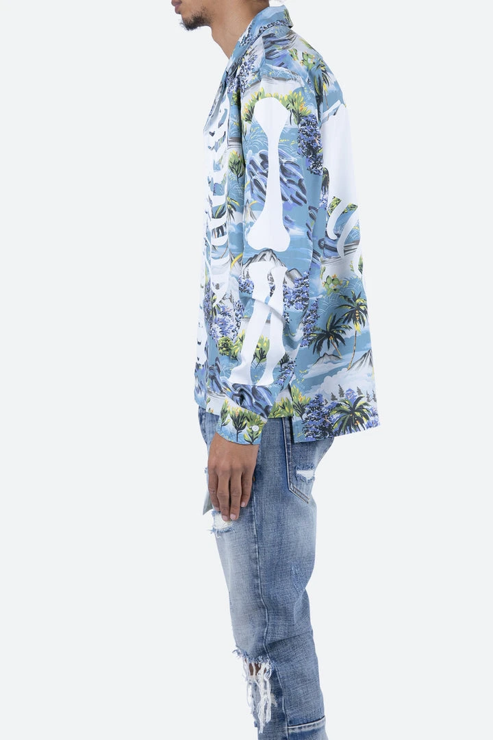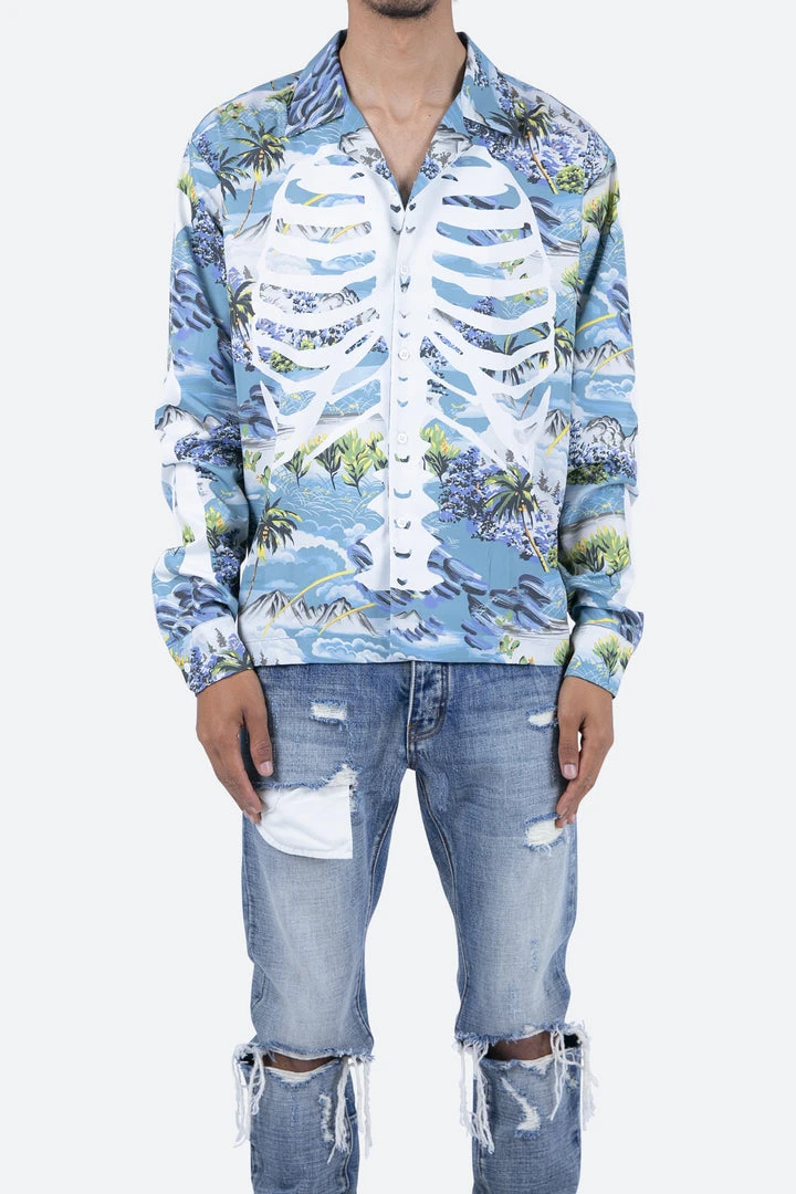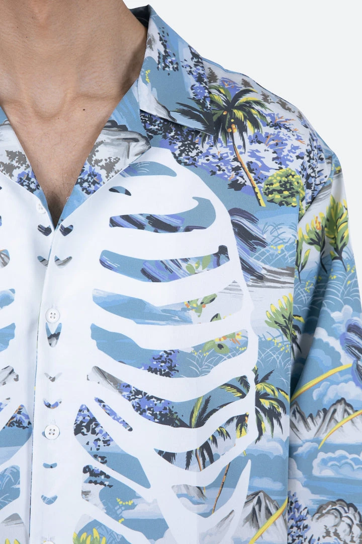 - Elevate your casual wardrobe with the Mnml Tops Skeleton Tropical Shirt in Blue. This shirt features a bold skeleton tropical print, making it a standout piece for any occasion.