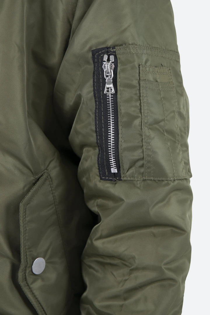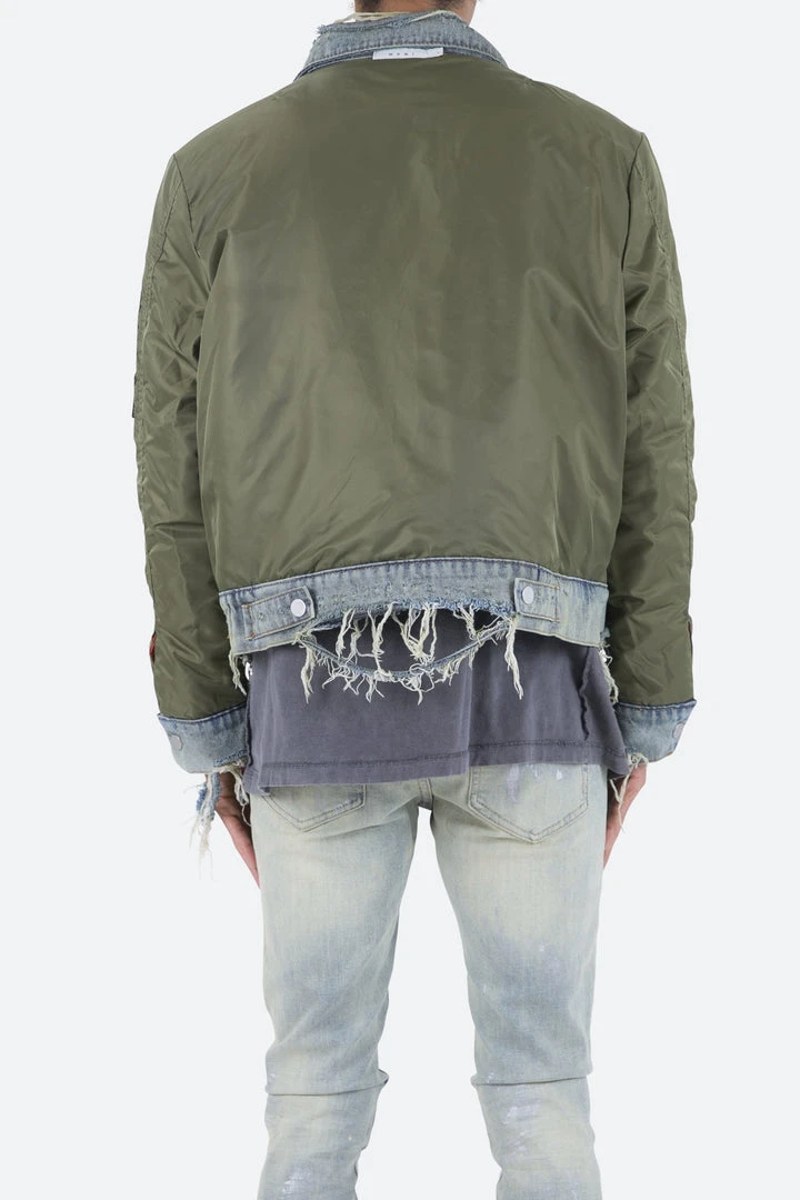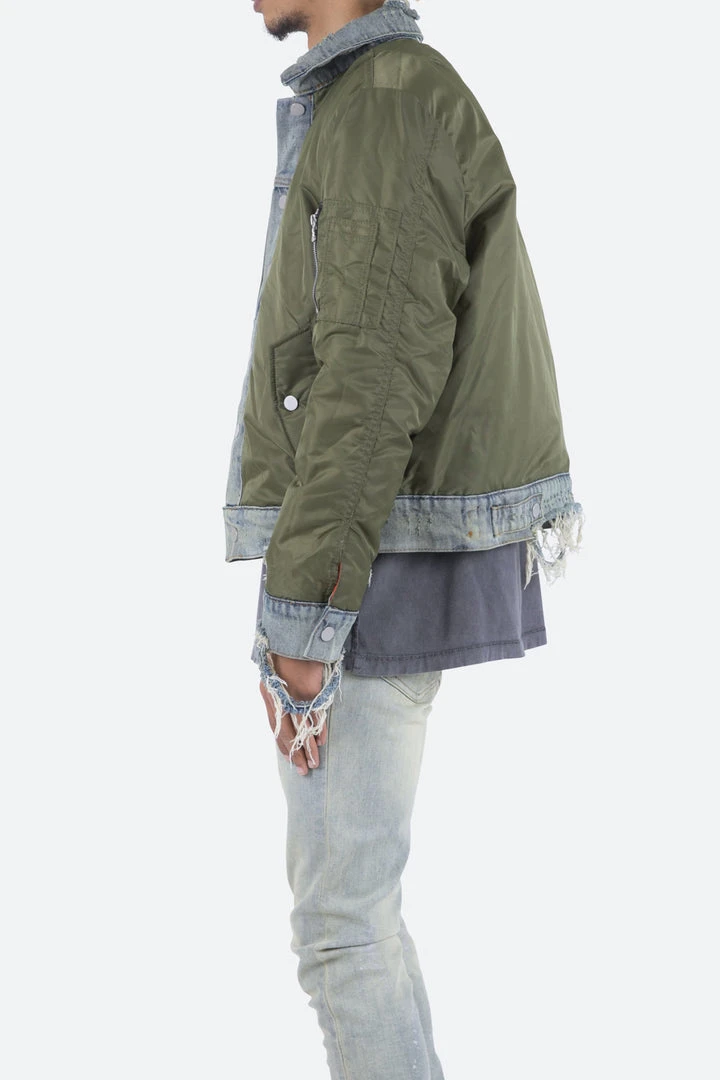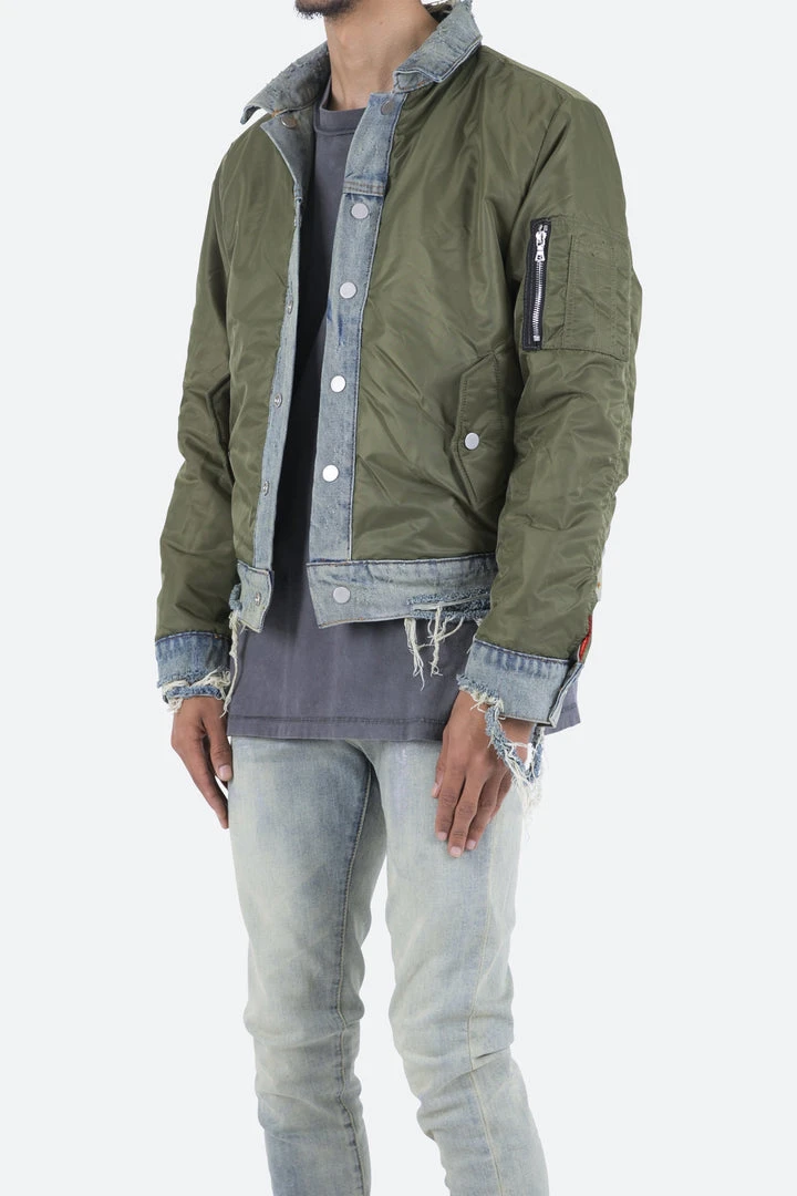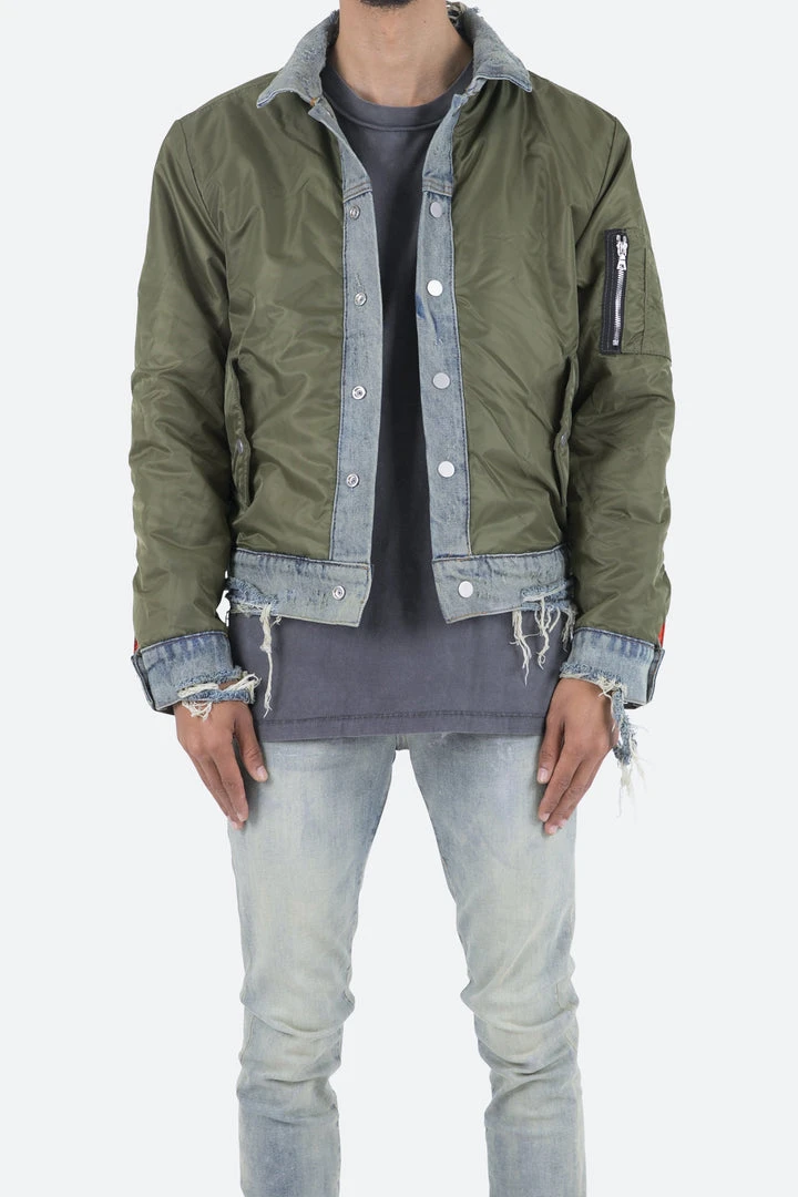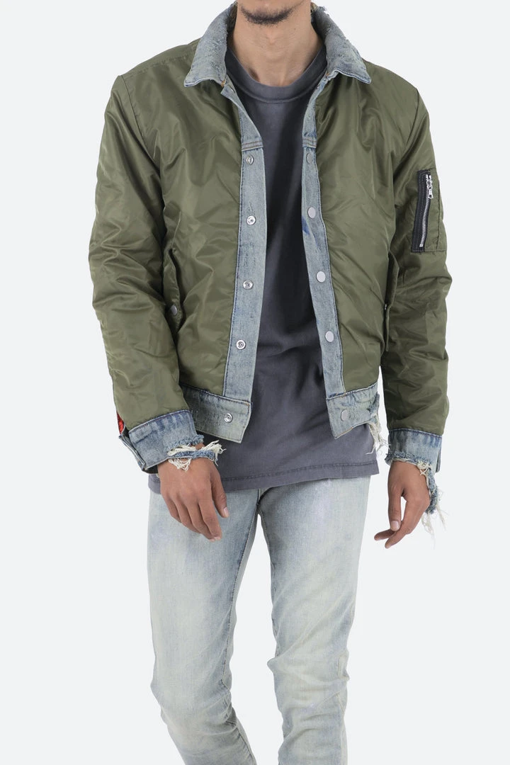 - Elevate your style with the Mnml Trucker Bomber Jacket in Olive. This lightweight jacket is perfect for layering and adds a modern edge to any outfit.
