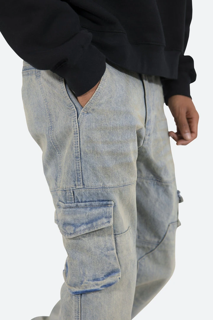 - Elevate your streetwear style with the Mnml V Baggy Denim V244 Cargo Baggy Denim in Vintage Blue. Designed for comfort and versatility, these cargo jeans feature a baggy fit and multiple utility pockets.