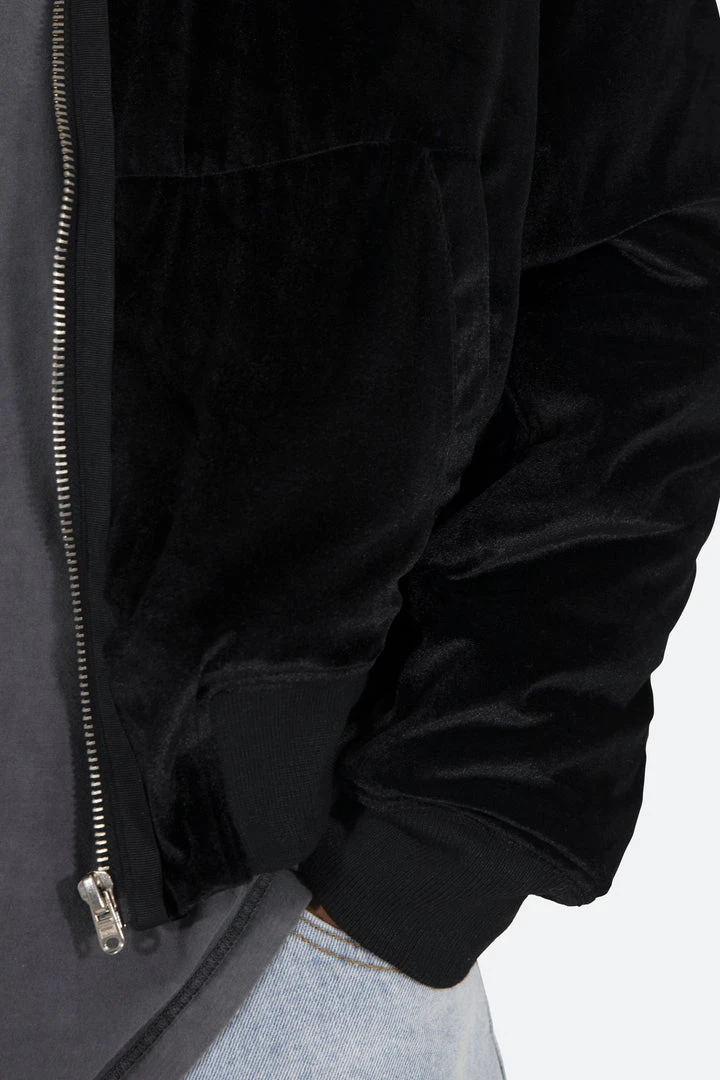 - Elevate your style with the Mnml Velour Bomber Jacket in Black. This premium men’s outerwear combines comfort and sophistication, making it a must-have for any wardrobe.