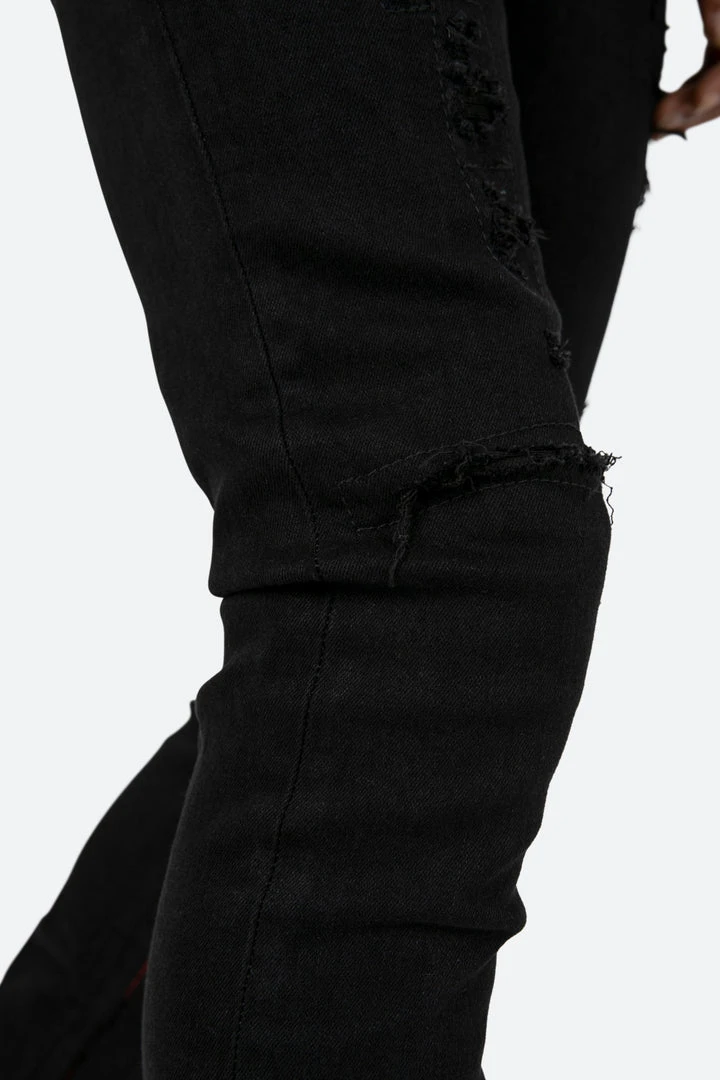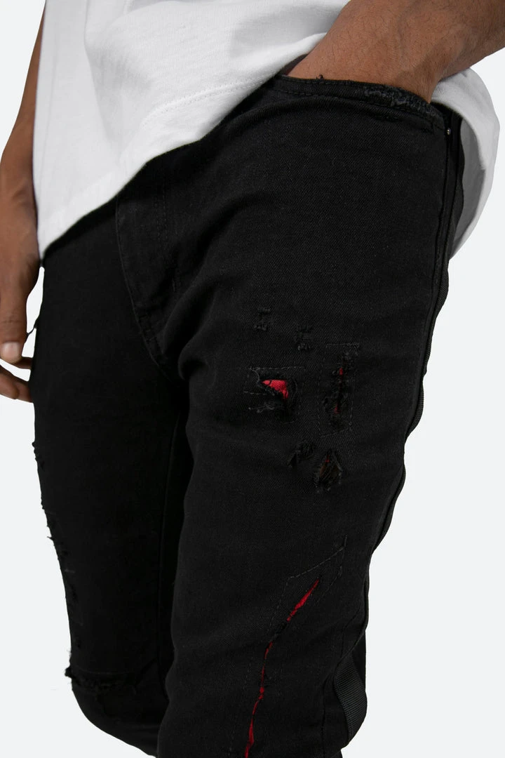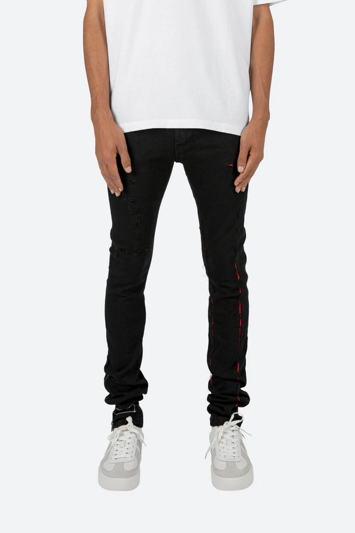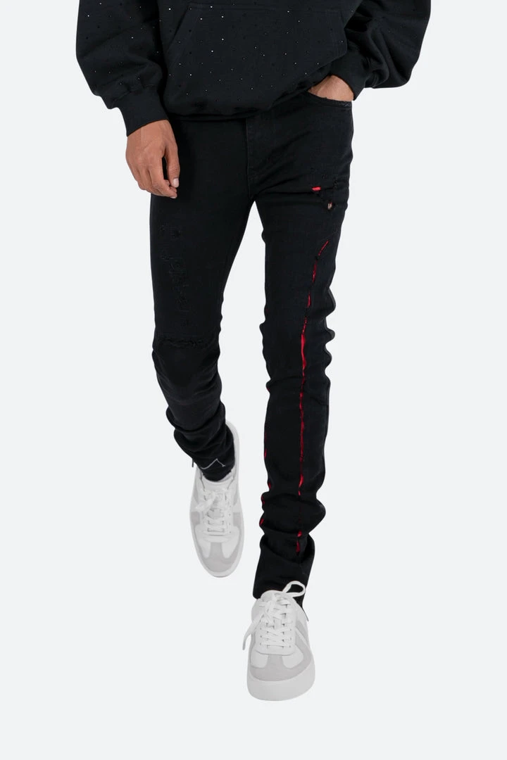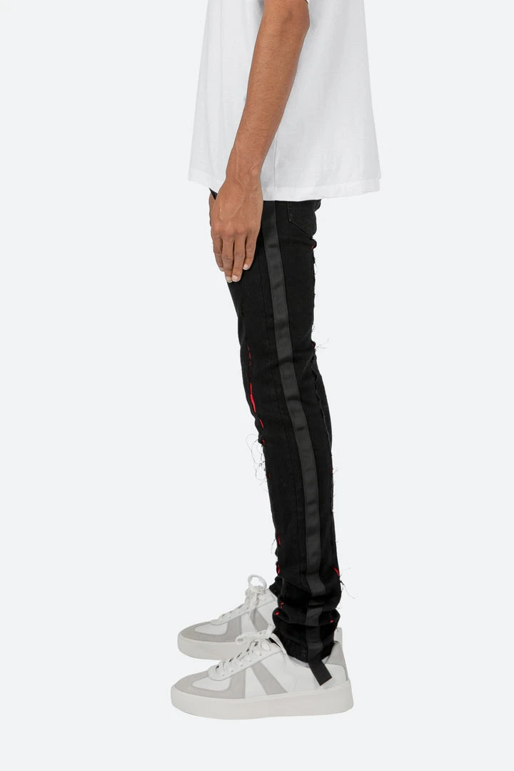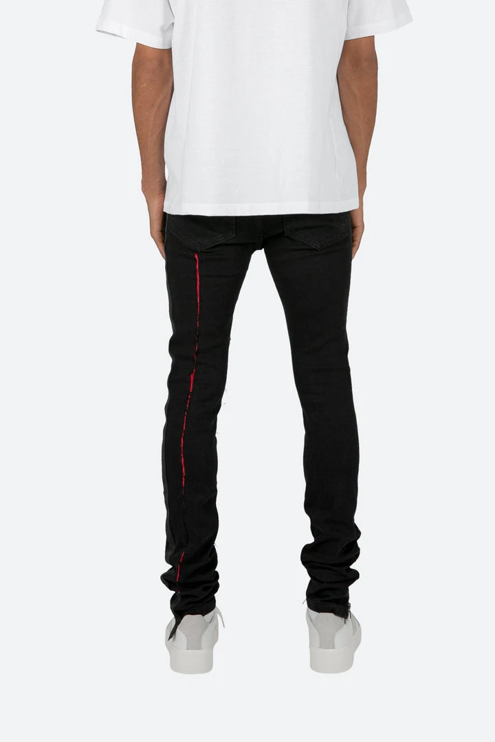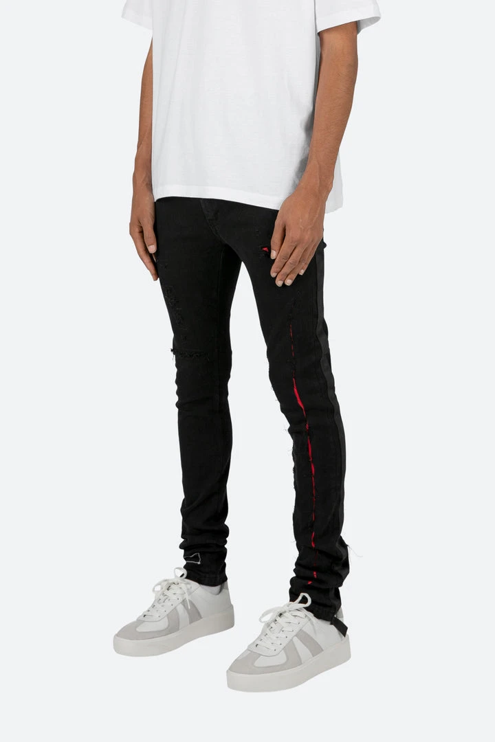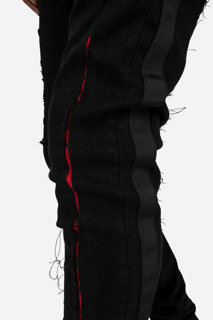 the X412 Lava Stretch Denim is designed with our new X fit which is skinny throughout with an extended inseam for stacking, and features contrasting red suede repair throughout, black webbing sewn down the outseam, and finished in a deep black stretch denim.
