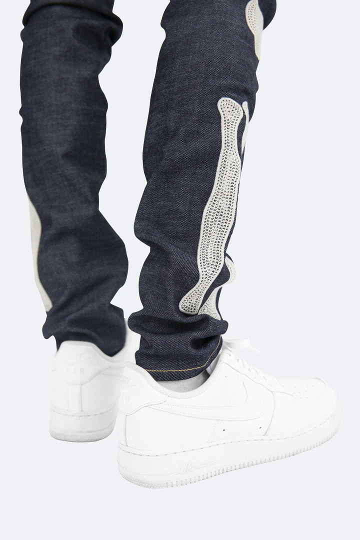 - Crafted from premium denim, the Mnml X199 Skeleton Skinny Denim offers durability and comfort. The raw blue color provides a versatile style that pairs well with any outfit.