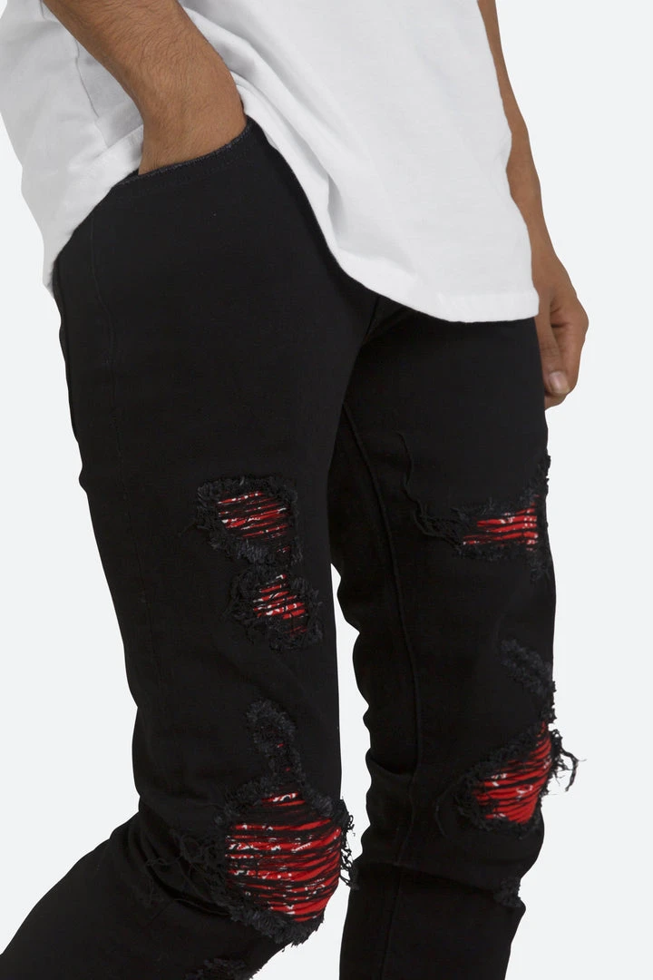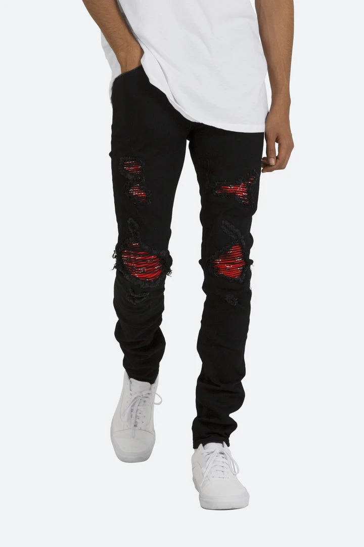 - Crafted from premium denim, the Mnml X285 Moto Skinny Jeans offer durability and a perfect fit. The Black/Red color combination adds a bold touch to your wardrobe.